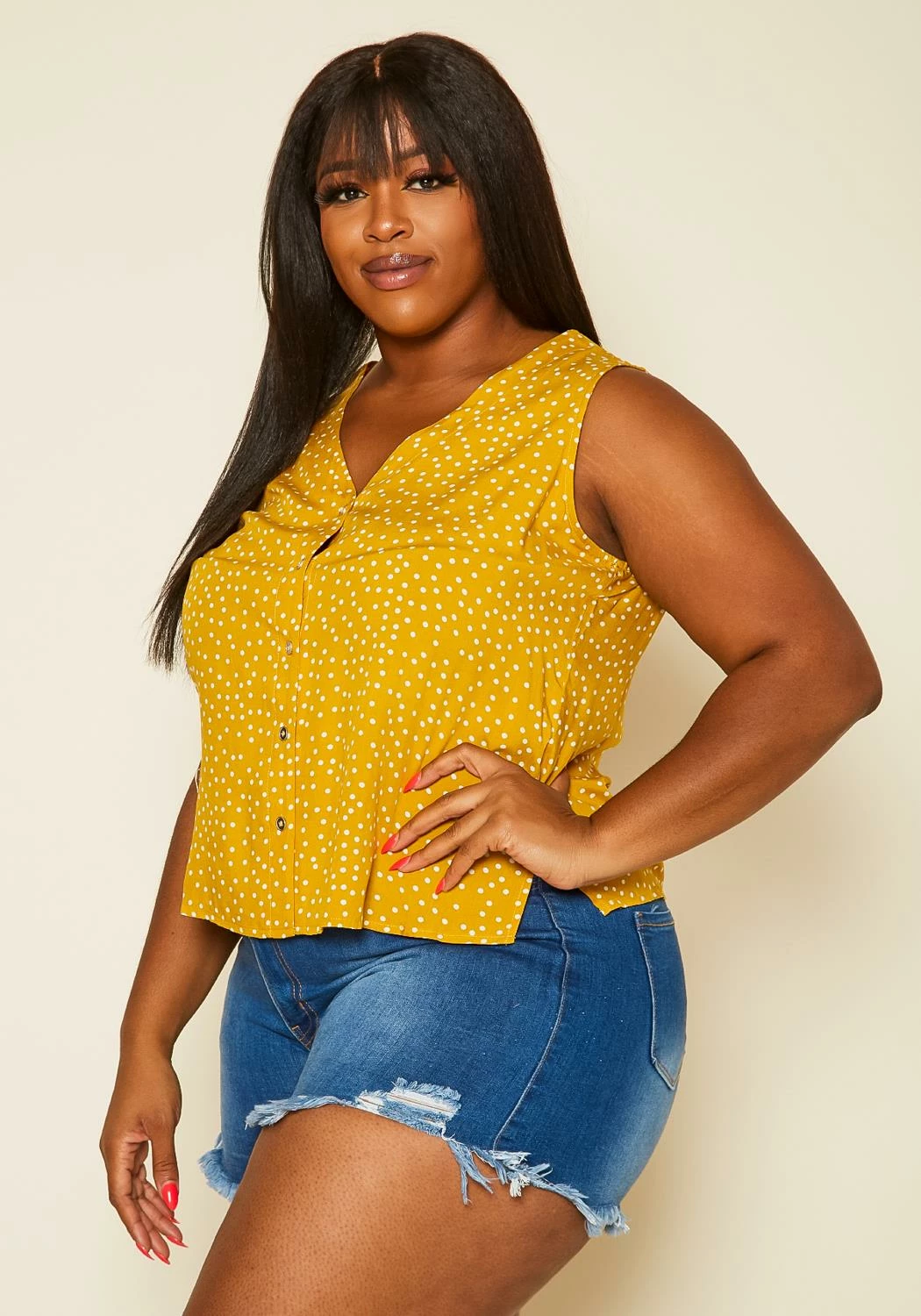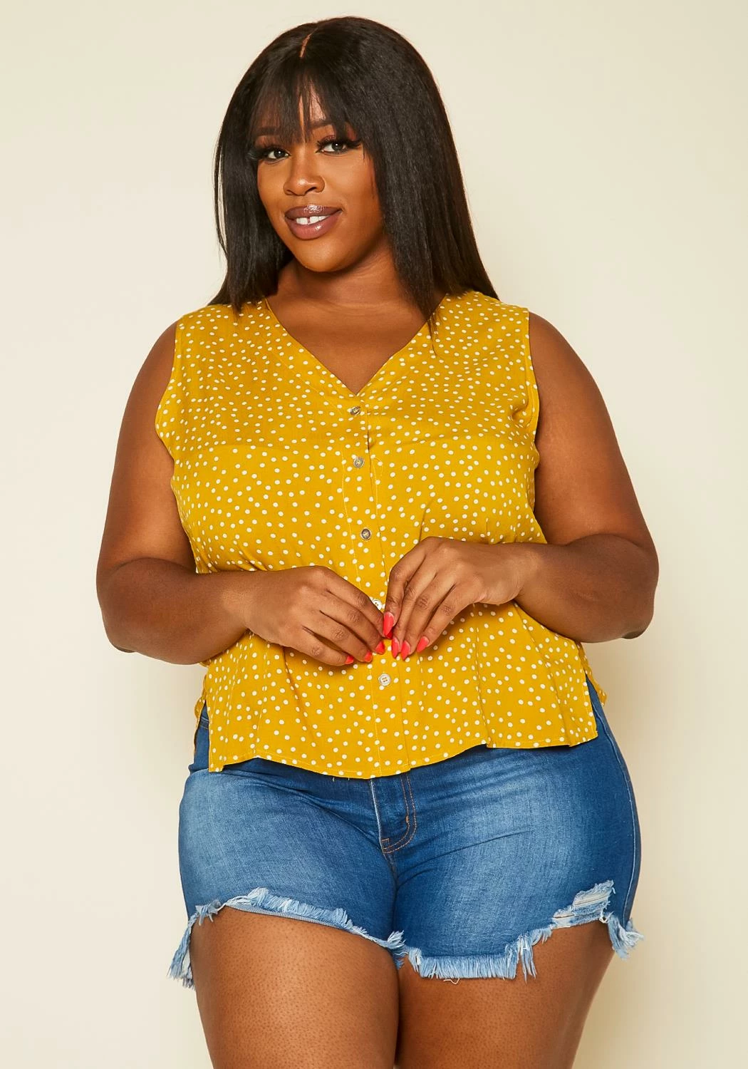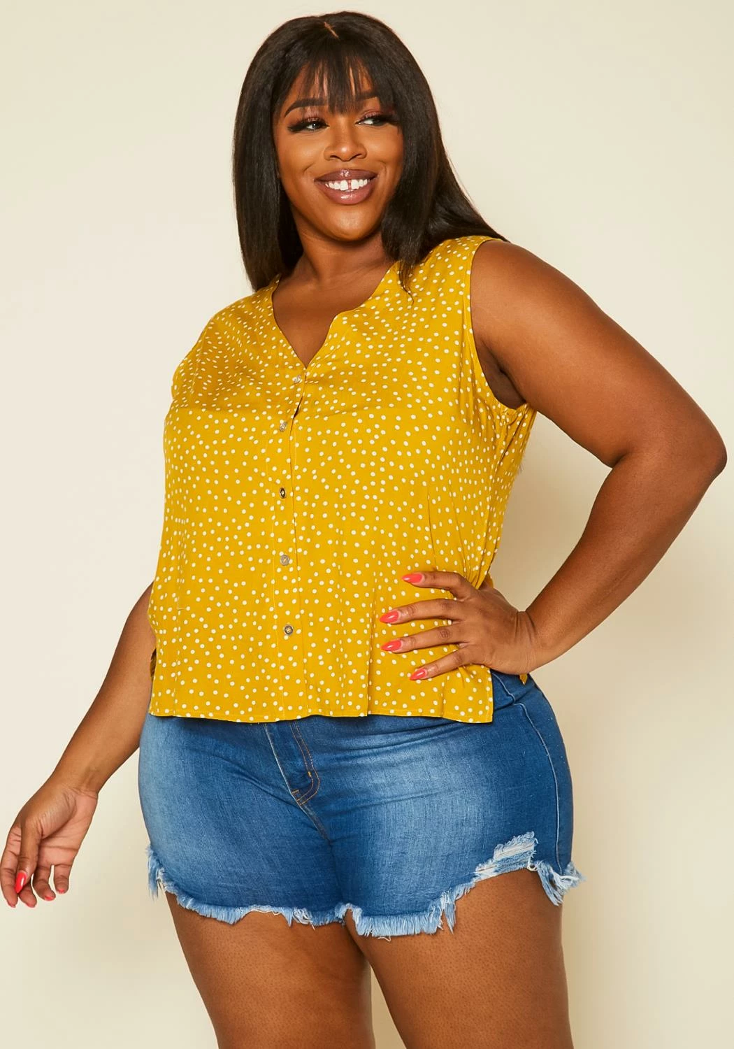 Plus size women’s top, featuring polka dot print, v-neck hem, sleeveless & button front closure.