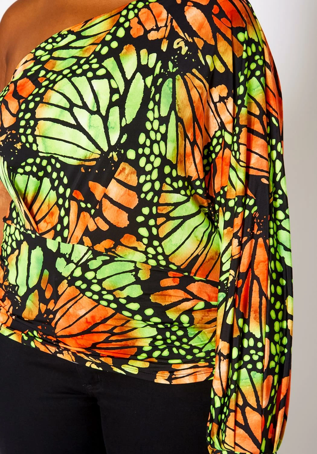 One of a kind plus size women’s blouse in one sleeve design, drape hem detail and fitted hem.