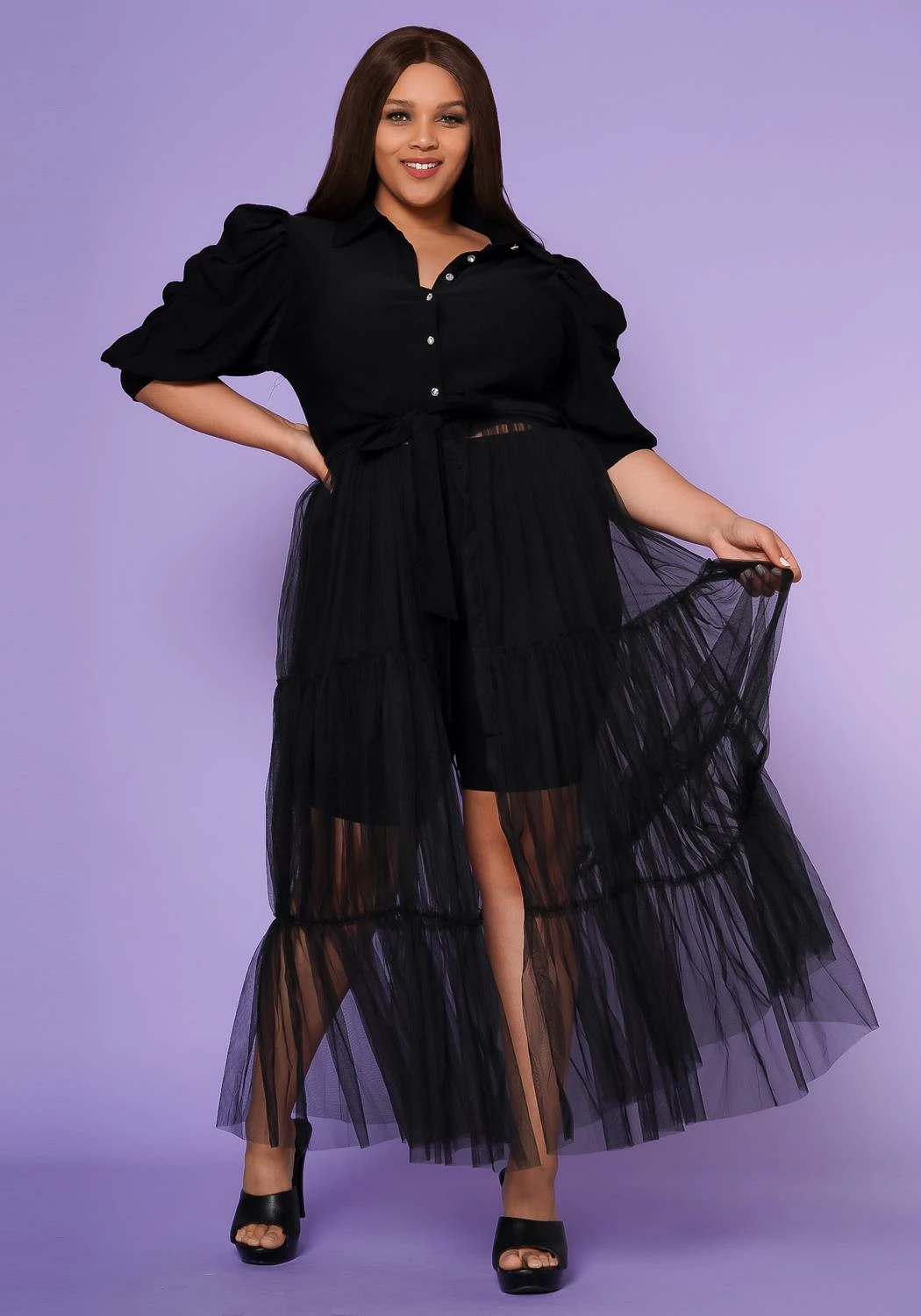 Elegant long tulle blouse made with sheer fabric at the bottom and opaque fabric at the top portion. Features puff short sleeves, button front closure, waist tie ascent and collar neckline. Pair it up with shorts underneath or skinny leather pants for a sophisticate look!
