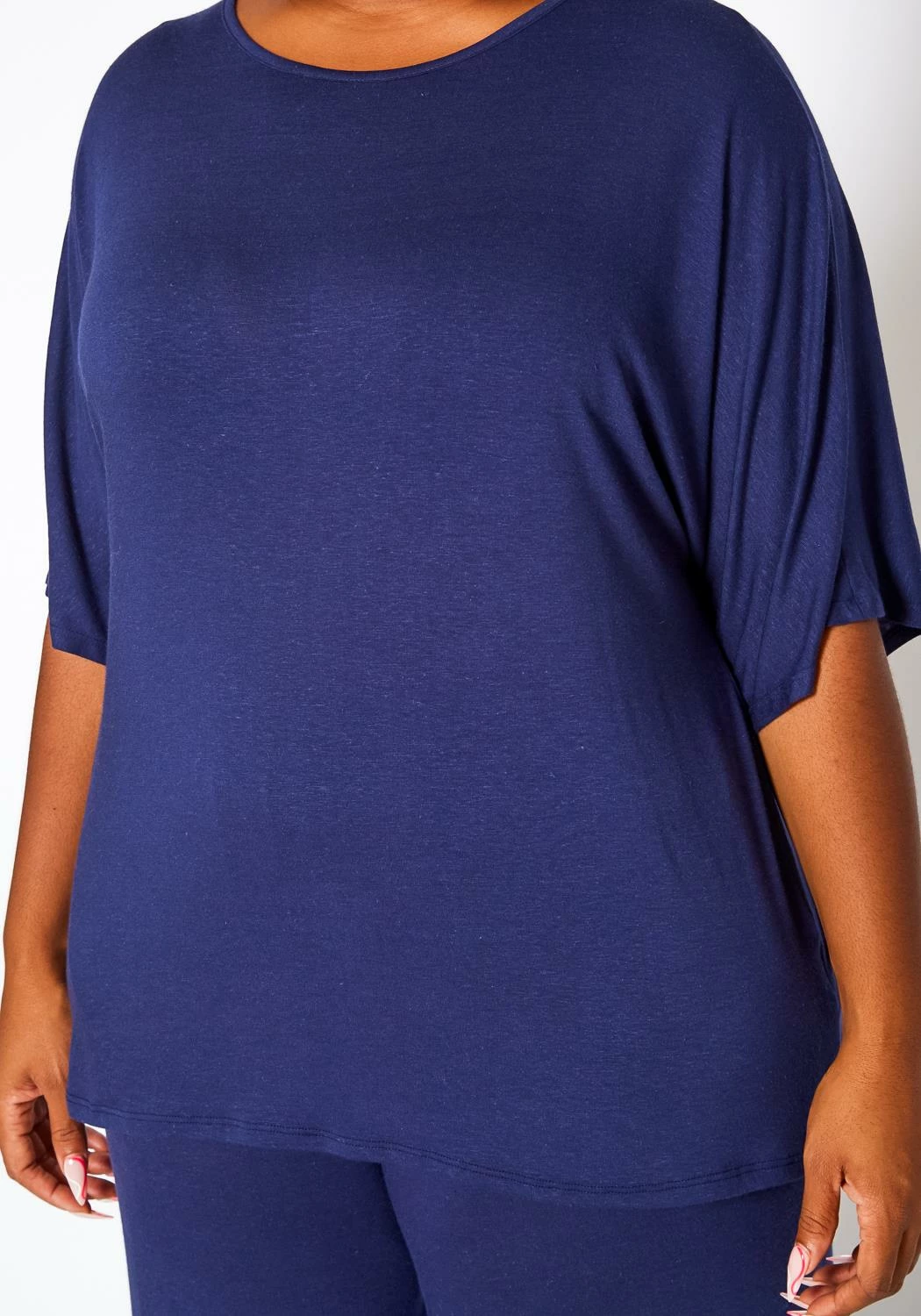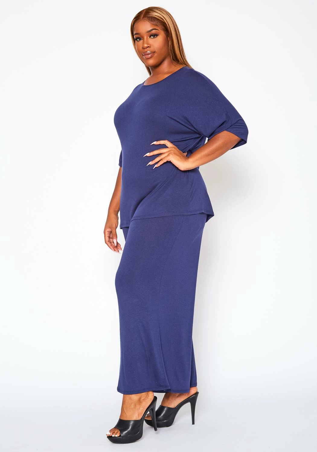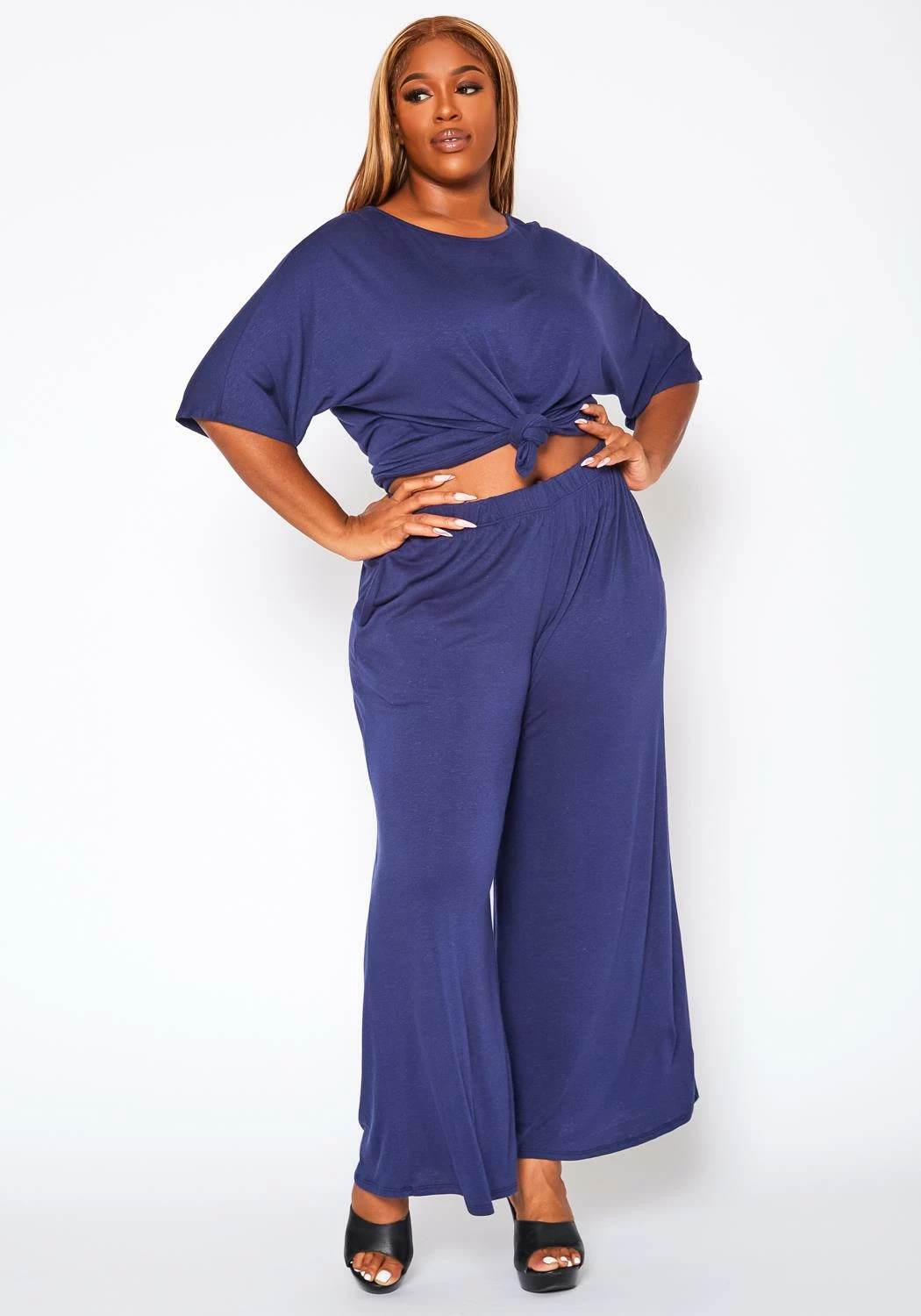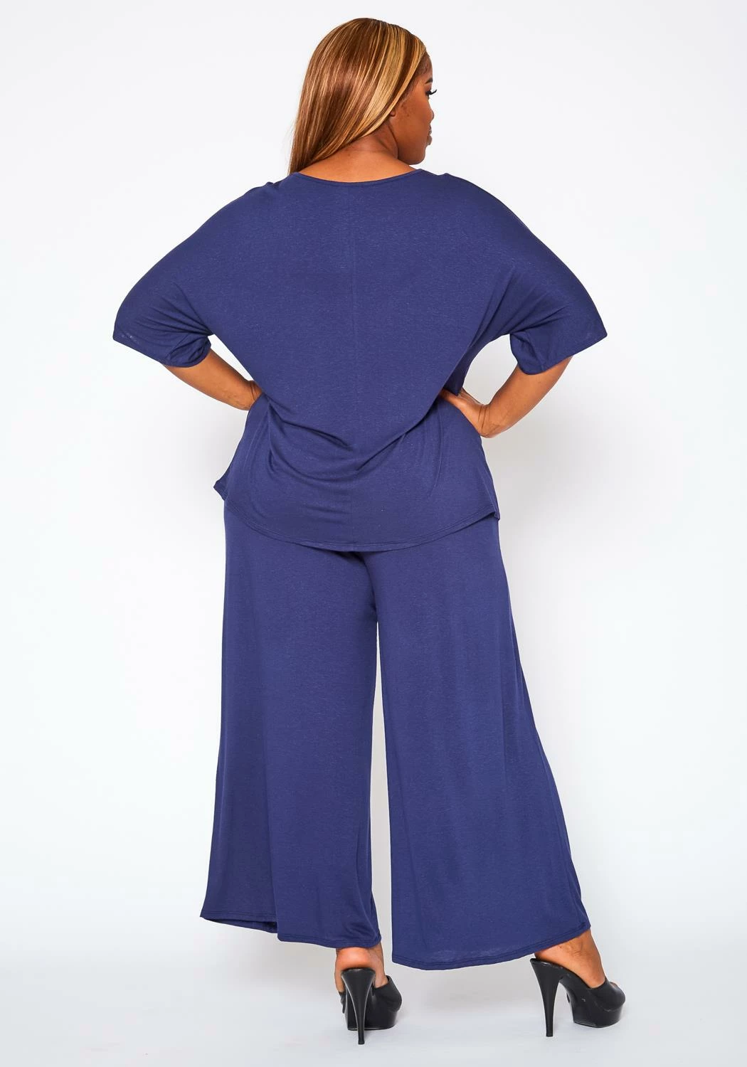 Comfortable plus size women’s two piece set which features a round neck style, half sleeve top and matching flare pants with pocket hem.