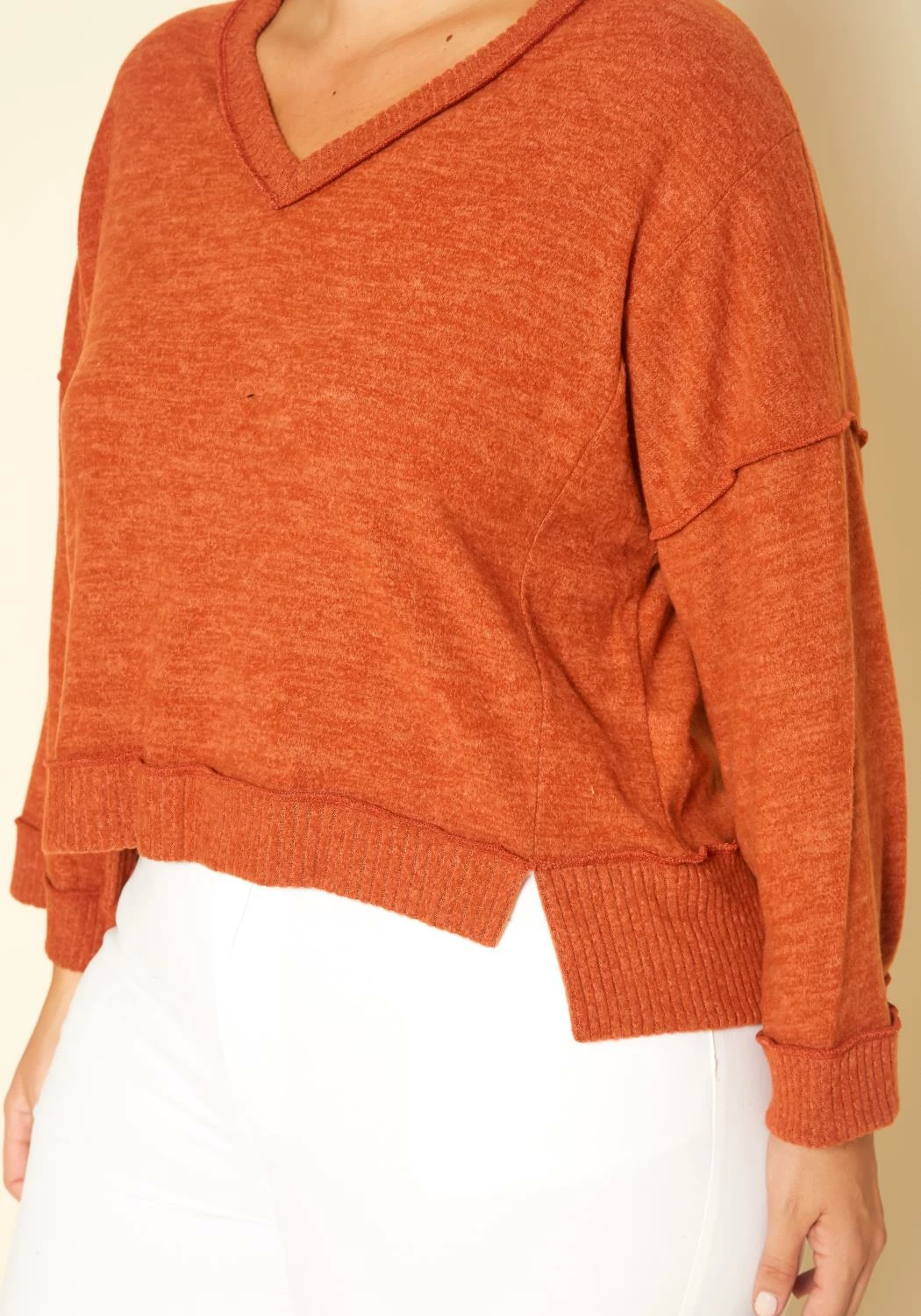 Casual plus size women’s sweater in v-neck style, relaxed fit and loose long sleeves.