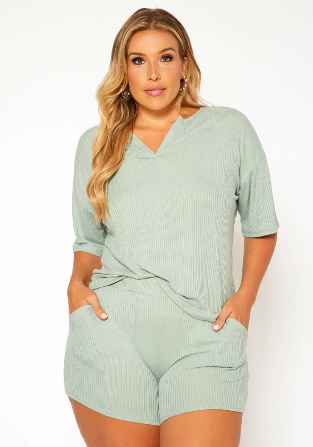 Comfy plus size women’s lounge set features a ribbed casual t-shirt with v-slit hem and pocket hem shorts.