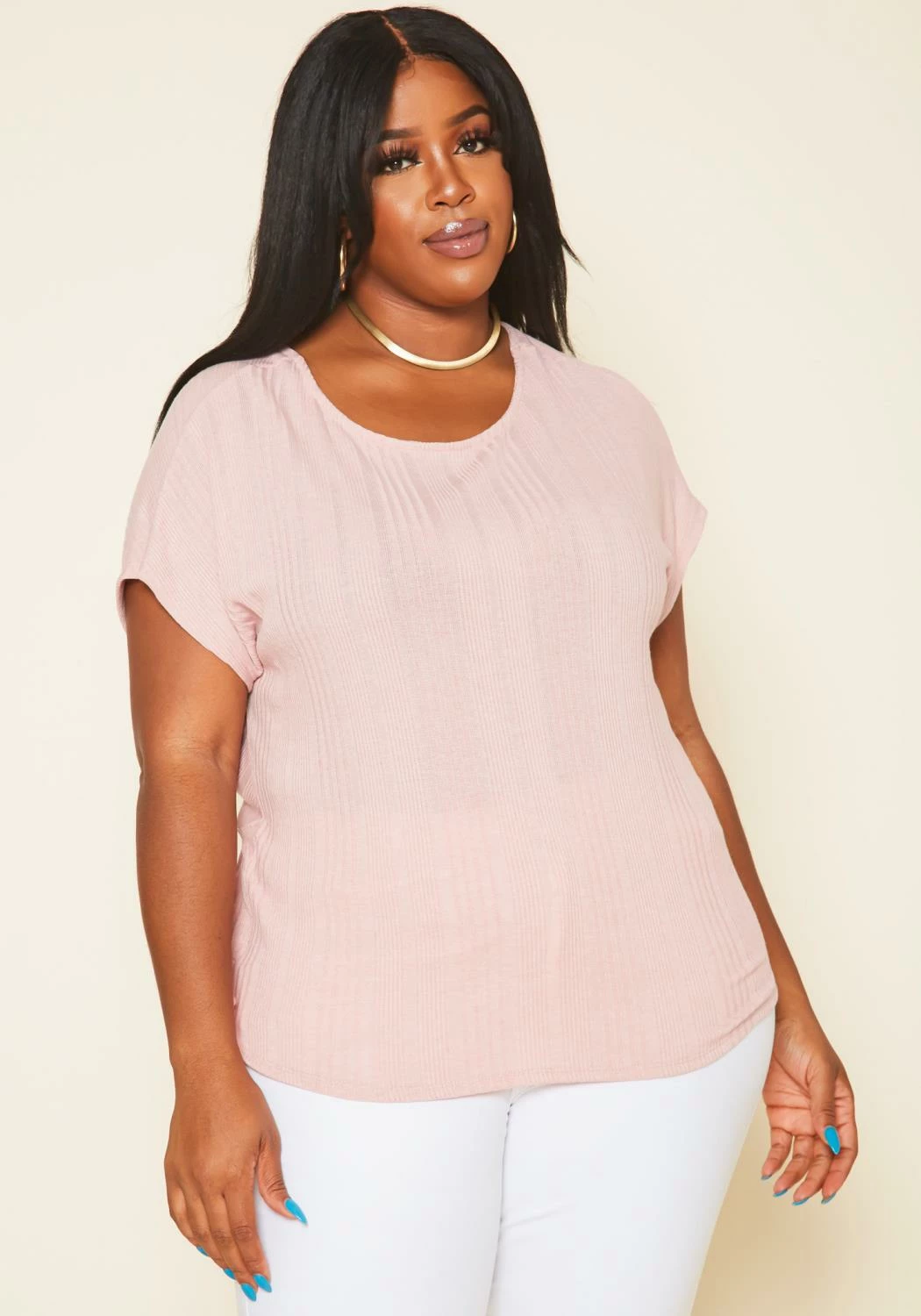 Casual plus size women’s top with ribbed material, round neck style, dolman short sleeves and back twist hem design.