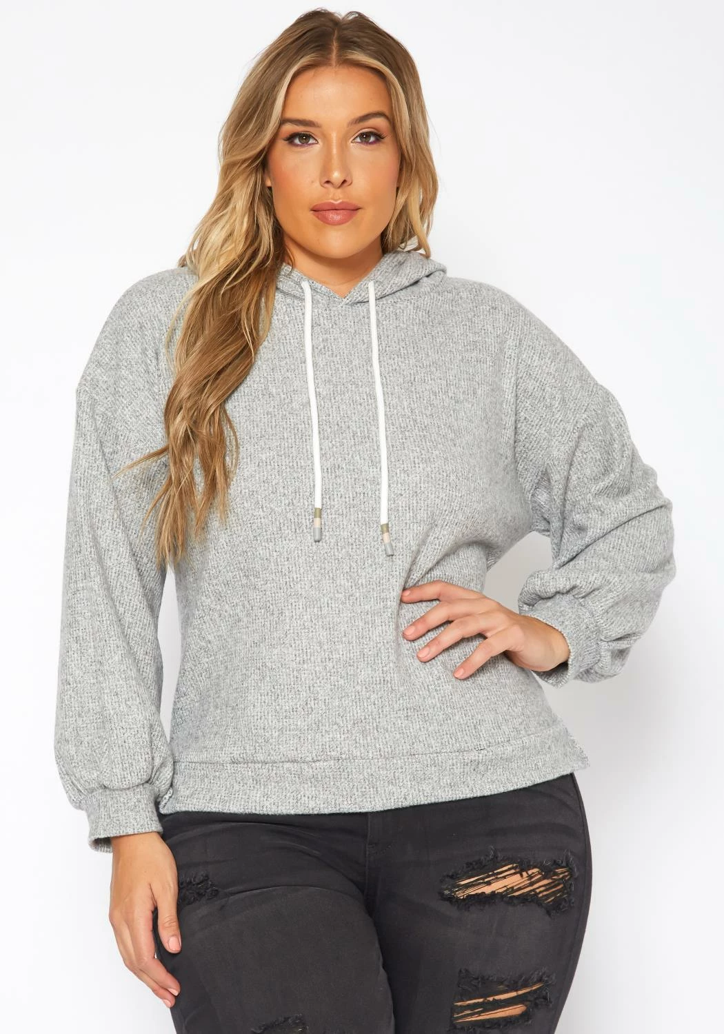 Cozy casual plus size women’s hooded sweater in ribbed knit material, hooded design with drawstring hem and fitted wrist cuffs.