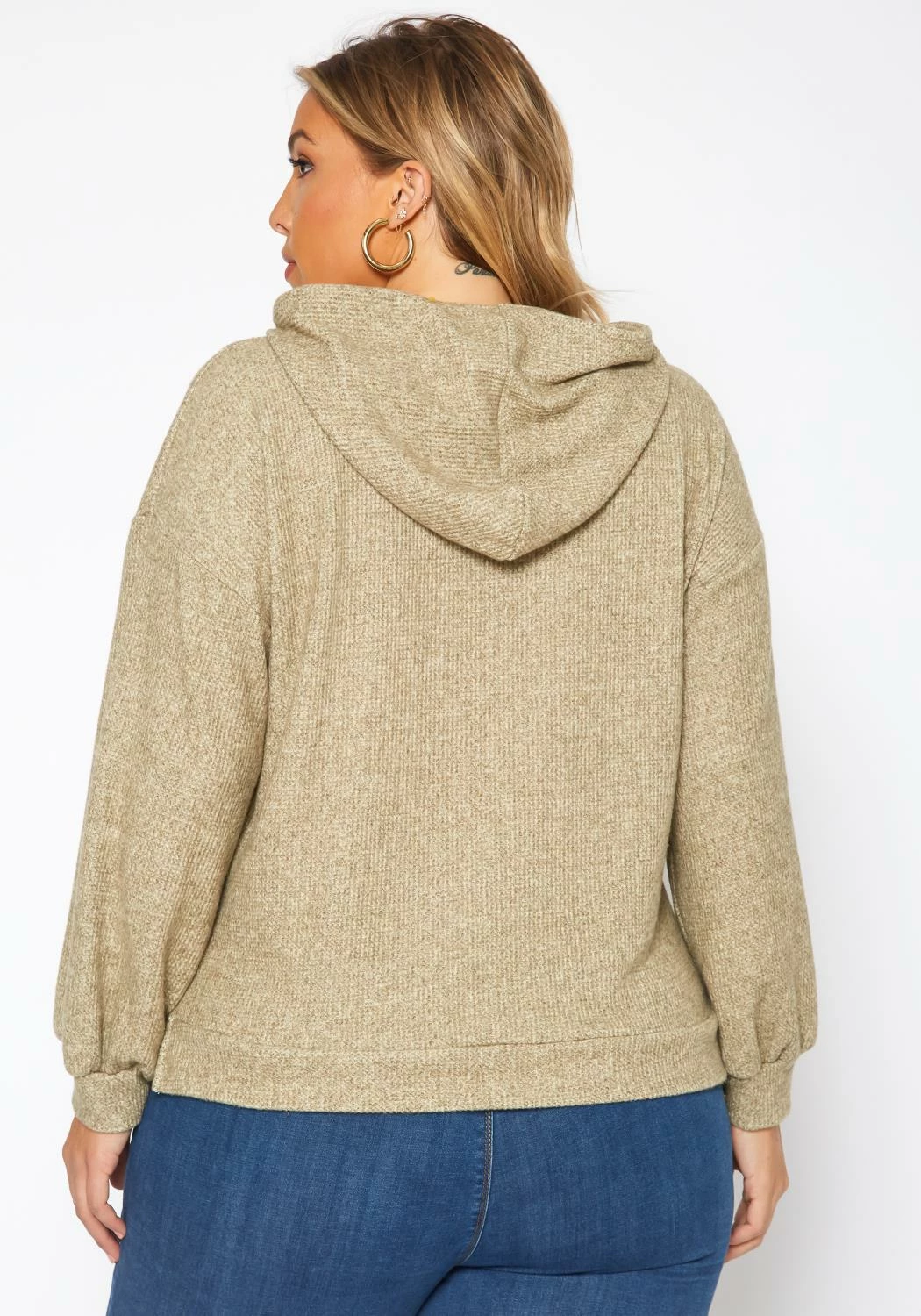 Cozy casual plus size women’s hooded sweater in ribbed knit material, hooded design with drawstring hem and fitted wrist cuffs.
