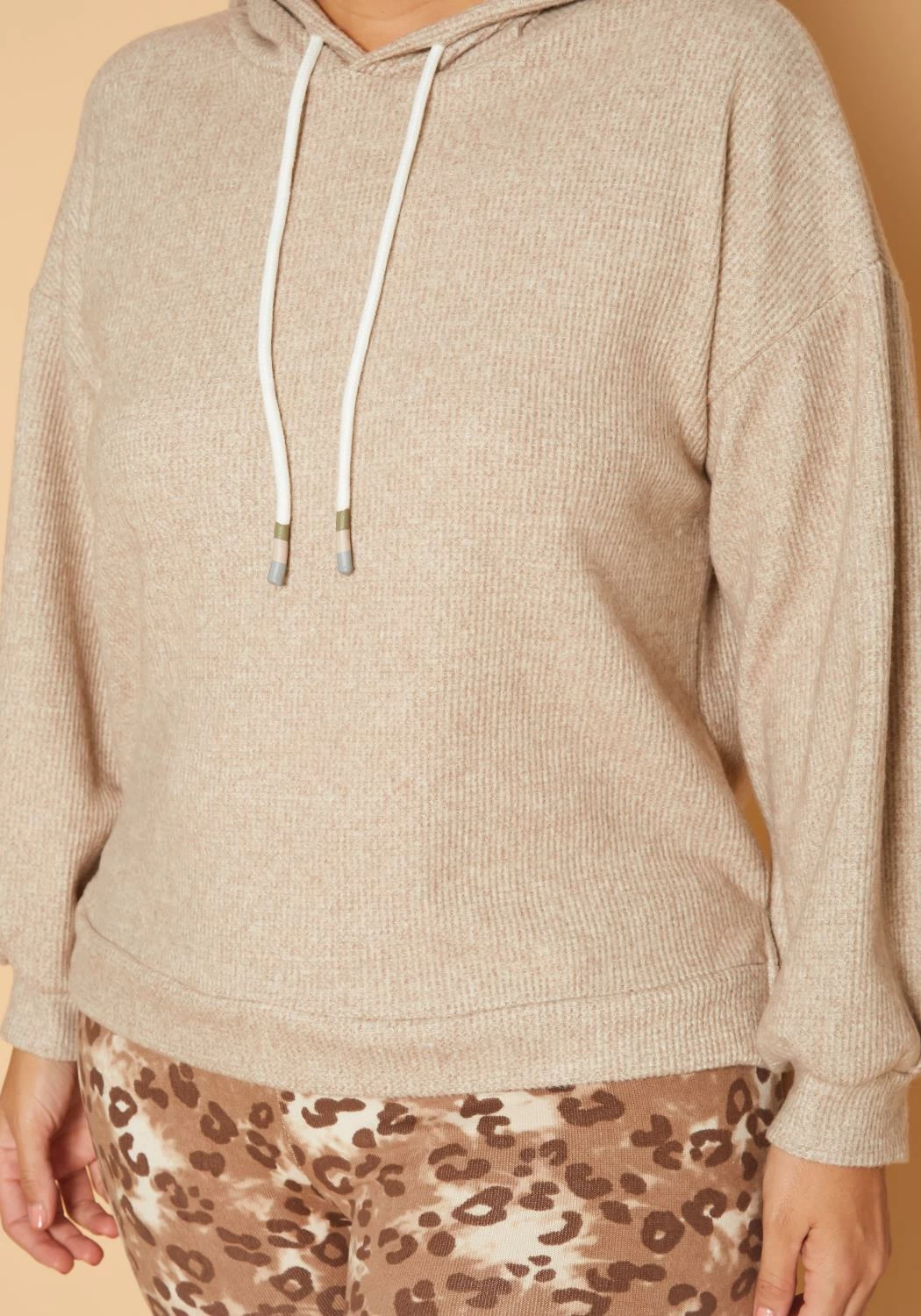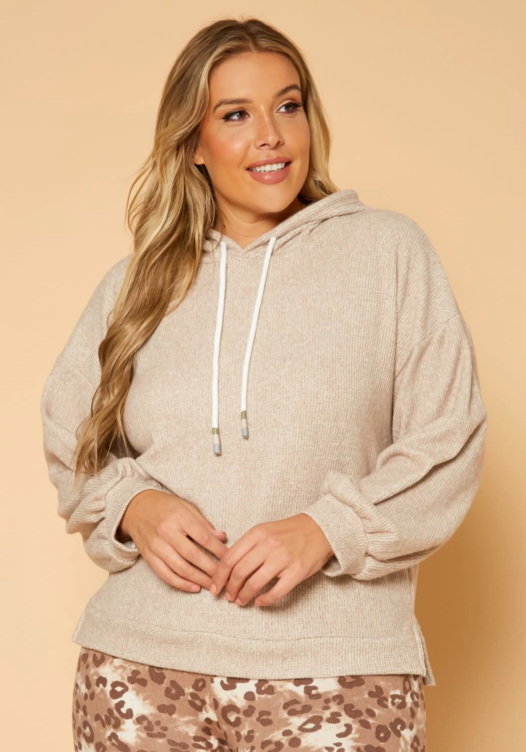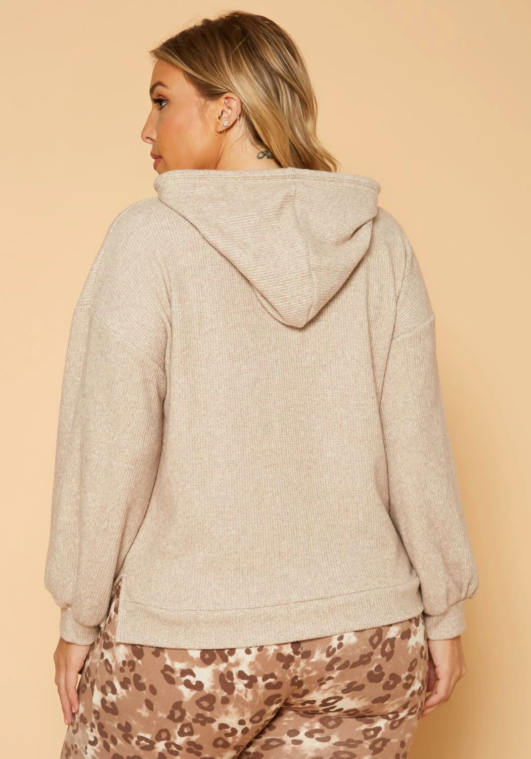 Cozy casual plus size women’s hooded sweater in ribbed knit material, hooded design with drawstring hem and fitted wrist cuffs.