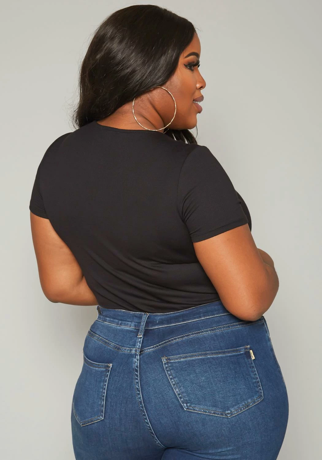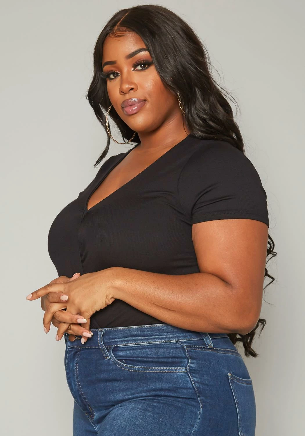 Must have plus size women’s bodysuit in ribbed material, v-neck style, short sleeves, wrap overlay design and snap button closure.