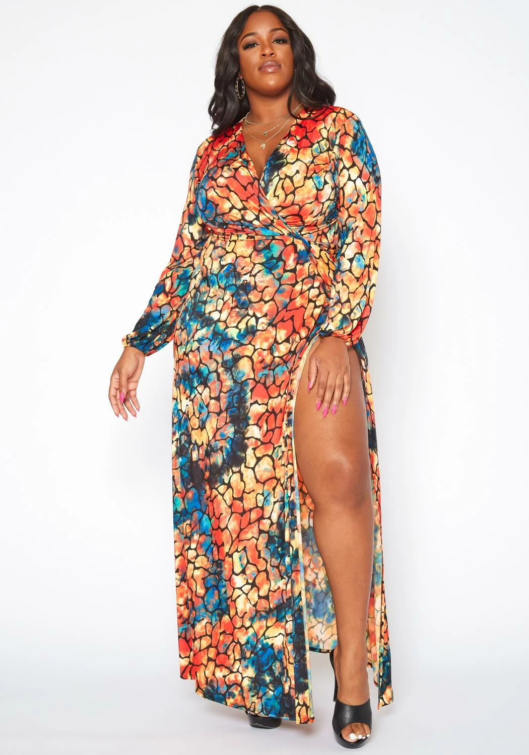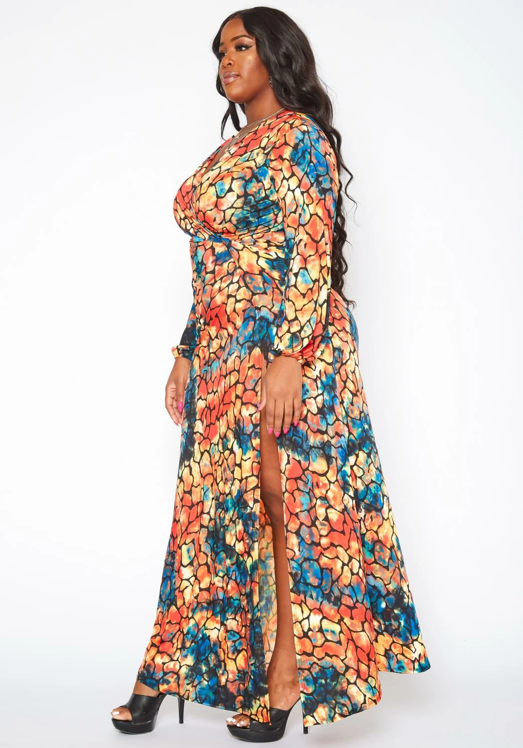 Plus size women’s fit & flare maxi dress in rocky pattern, v-neck style, long sleeves and single leg slit.
