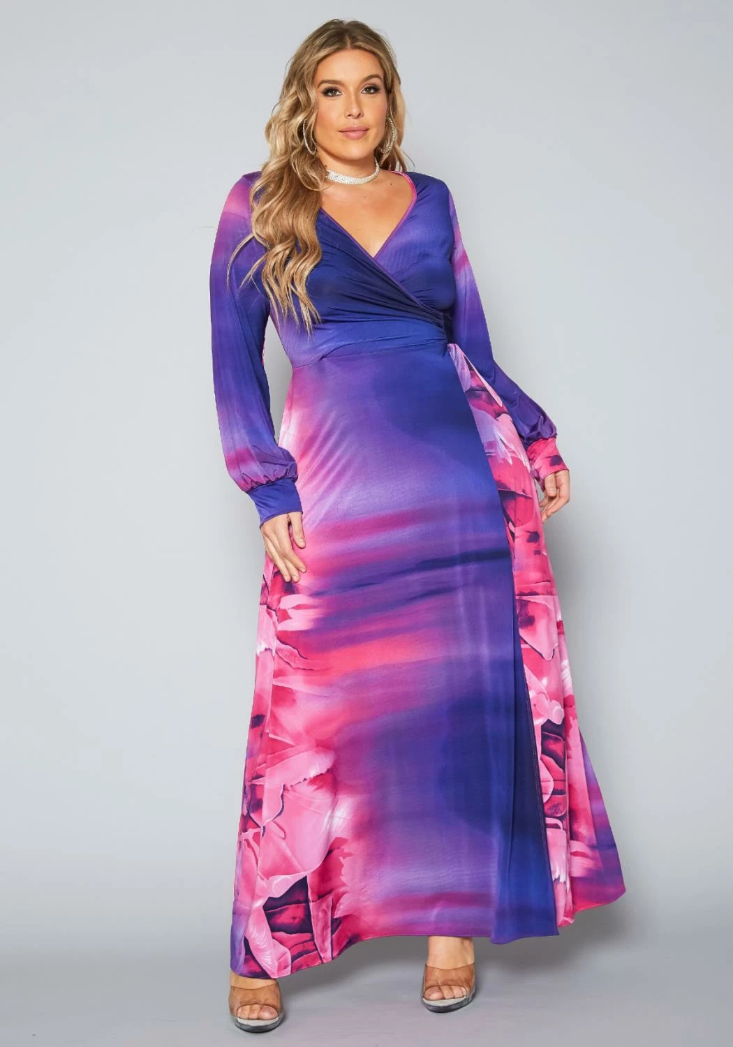 Unique plus size women’s fit & flare maxi dress in v-neck style, long sleeves with fitted wrist cuffs, wrap design and slit hem.