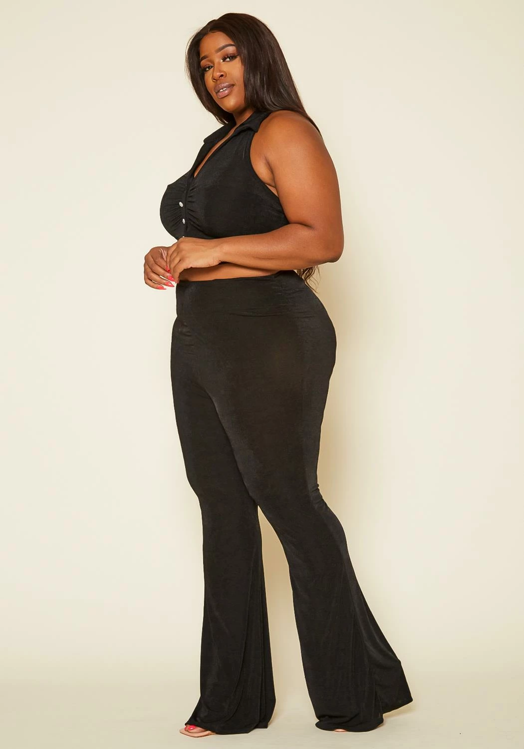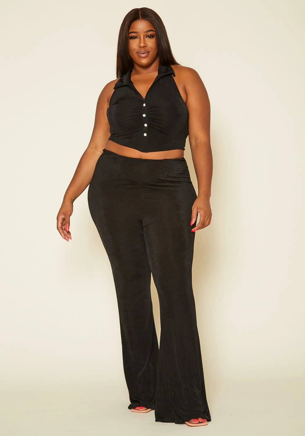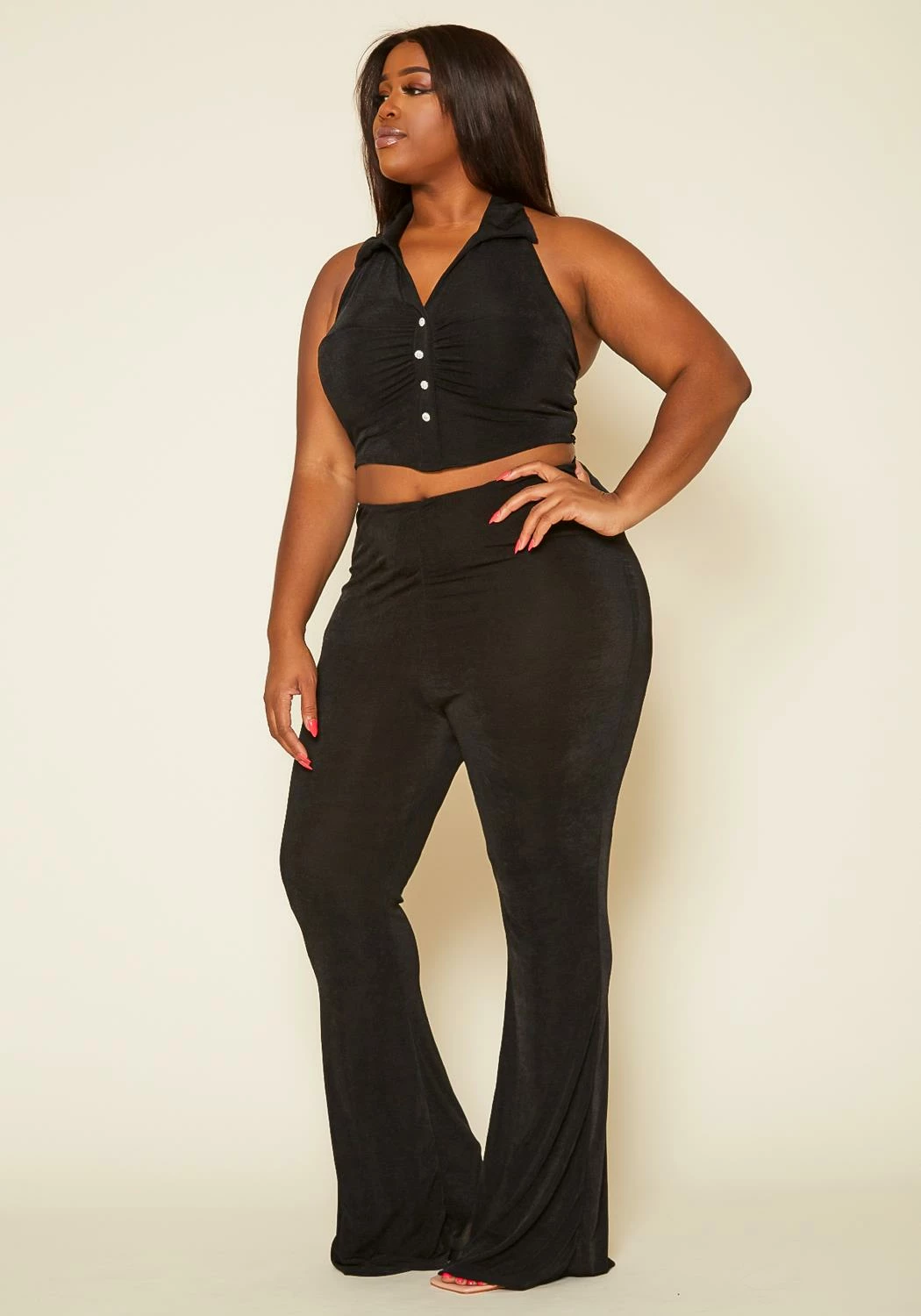 Plus size women’s set featuring a halter top with ruched front, button closure, straight back hem paired with high waste wide leg pants with ruched front, back and side detail.