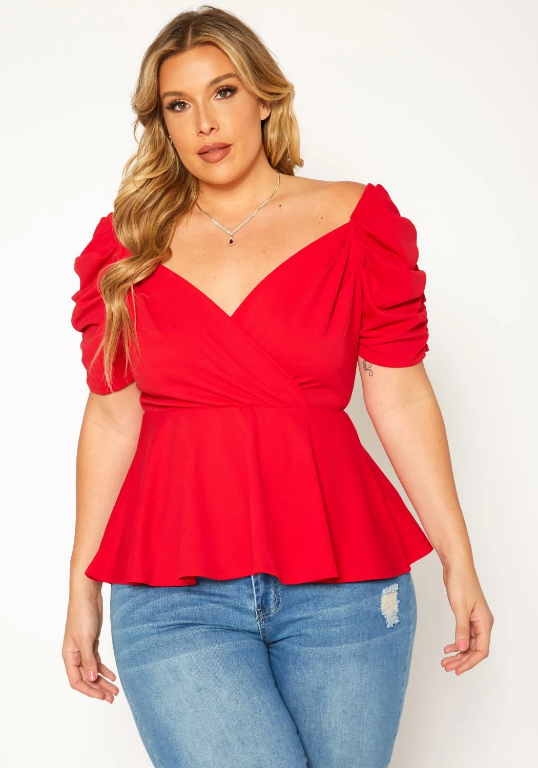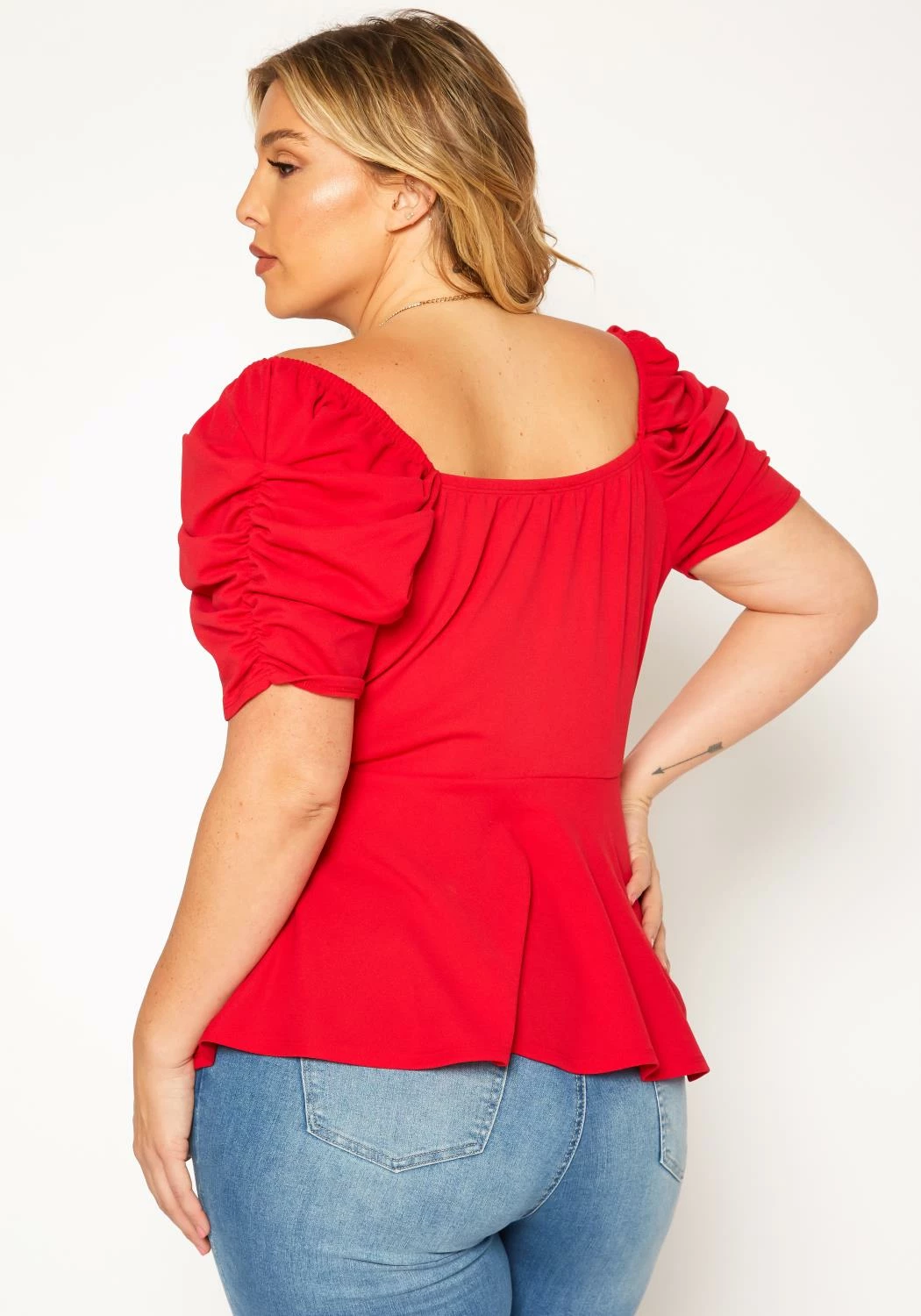 Lovely plus size women’s peplum top in sweetheart neck style, ruched short sleeves and peplum flare hem.