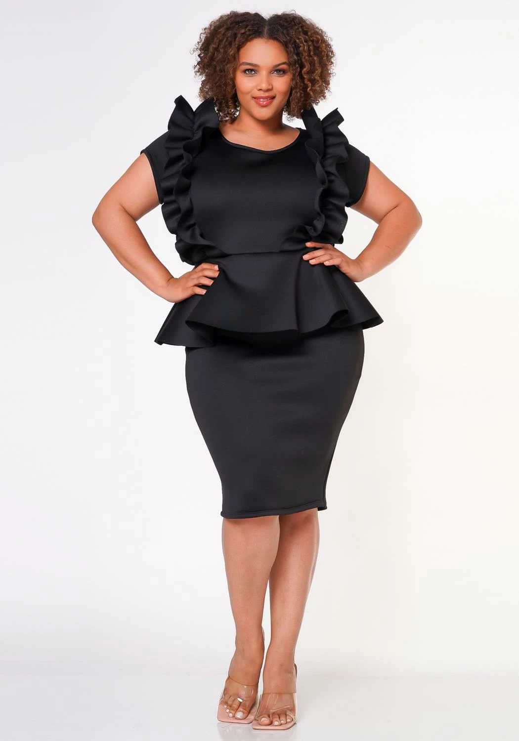 Plus size dress in peplum style featuring a ruffle detail on top and a bodycon fit.