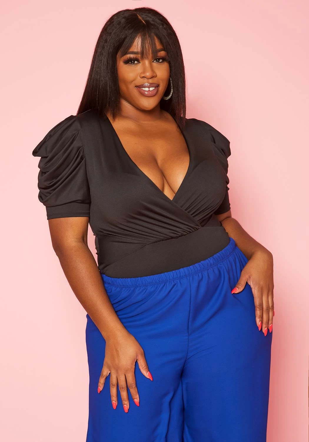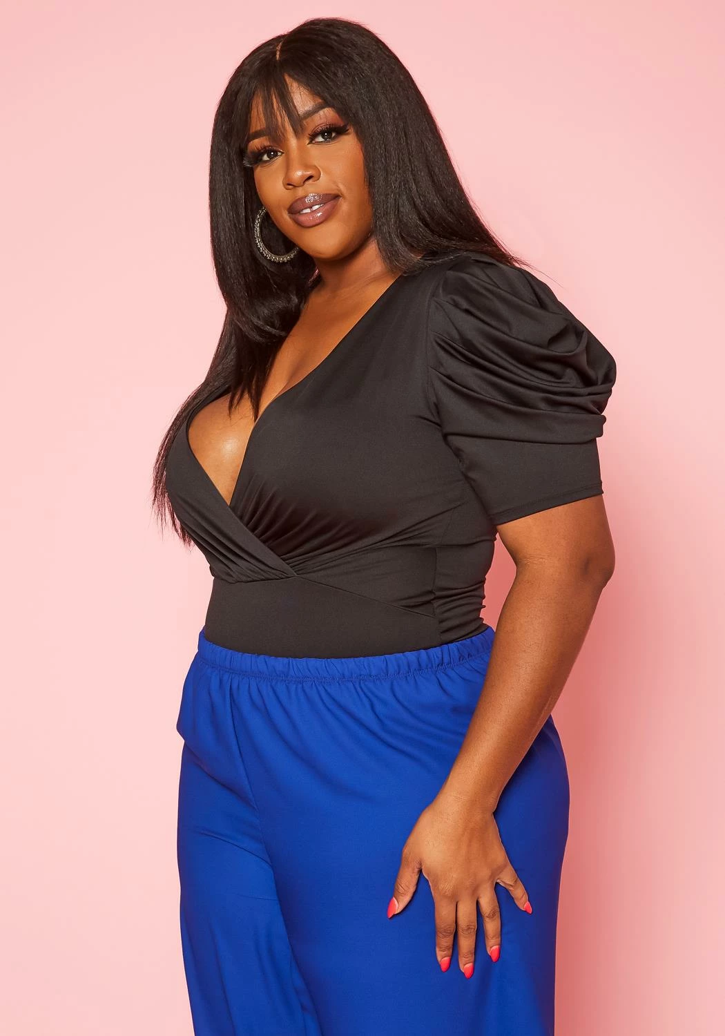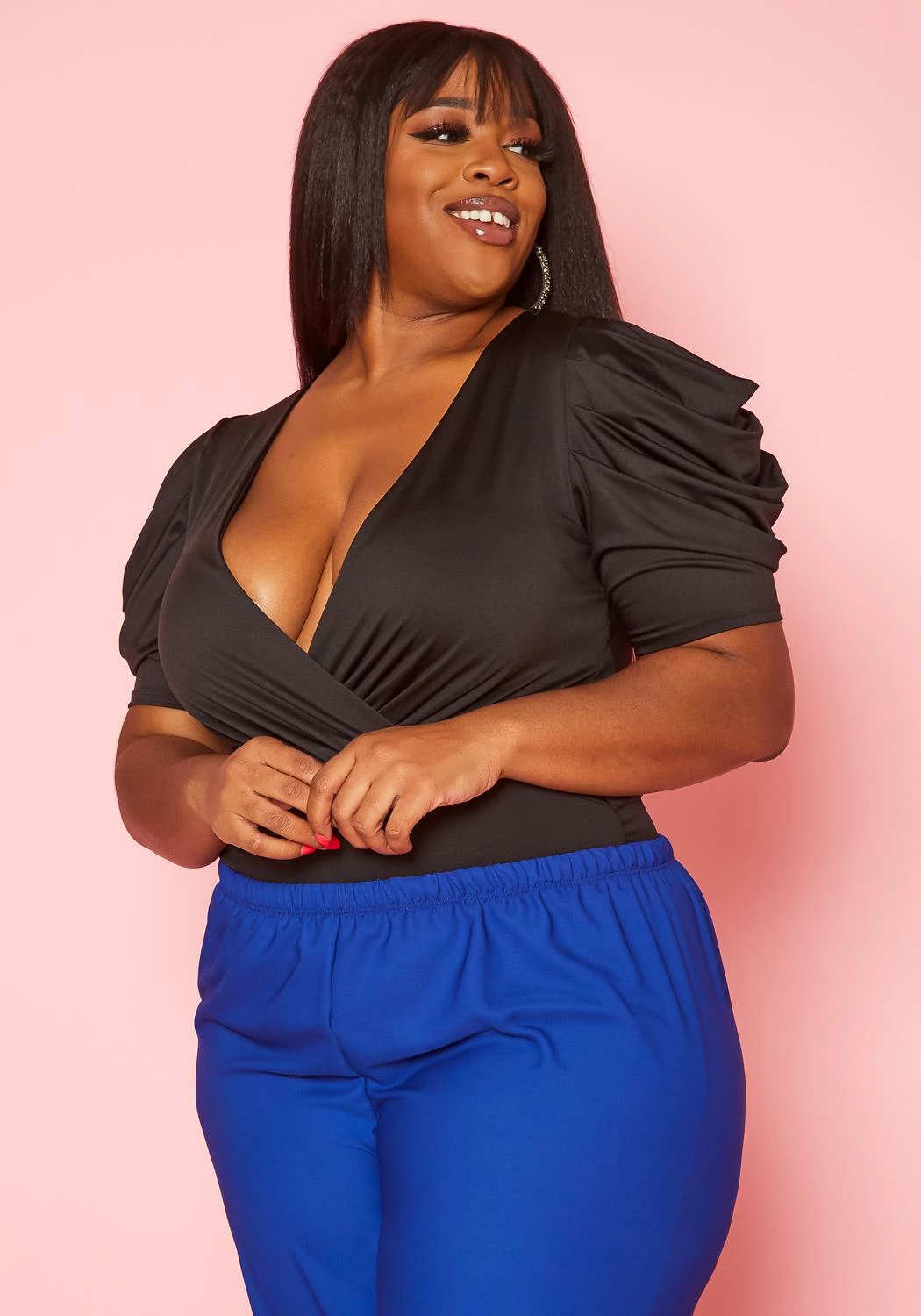 Plus size women’s top in bodysuit style, featuring a deep v-neck hem, short ruffled sleeves with snap on crotch closure.