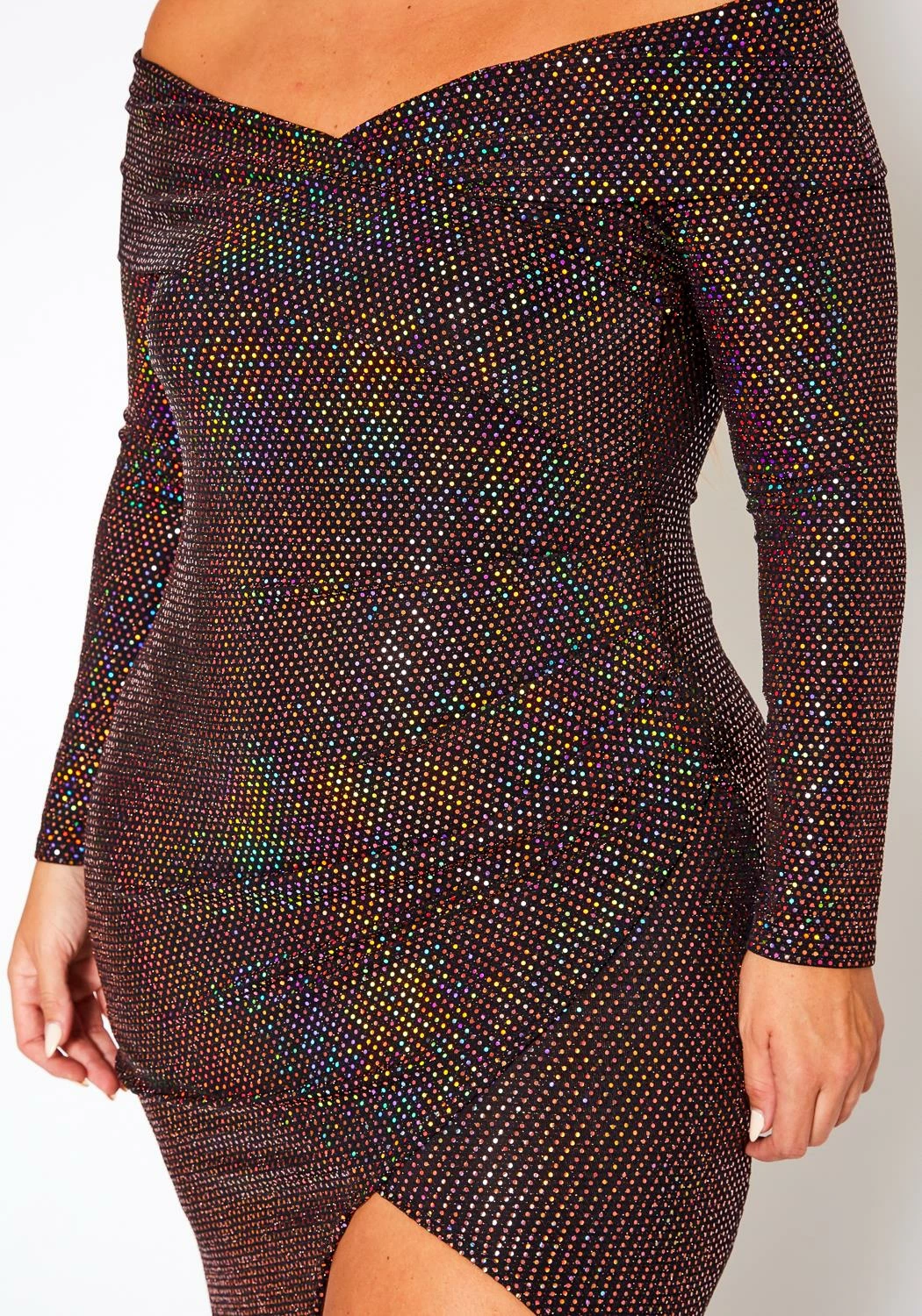 Party perfect plus size women’s midi dress in multi sequin design. Features off shoulder style, fitted long sleeves, leg slit hem and bodycon fitting.