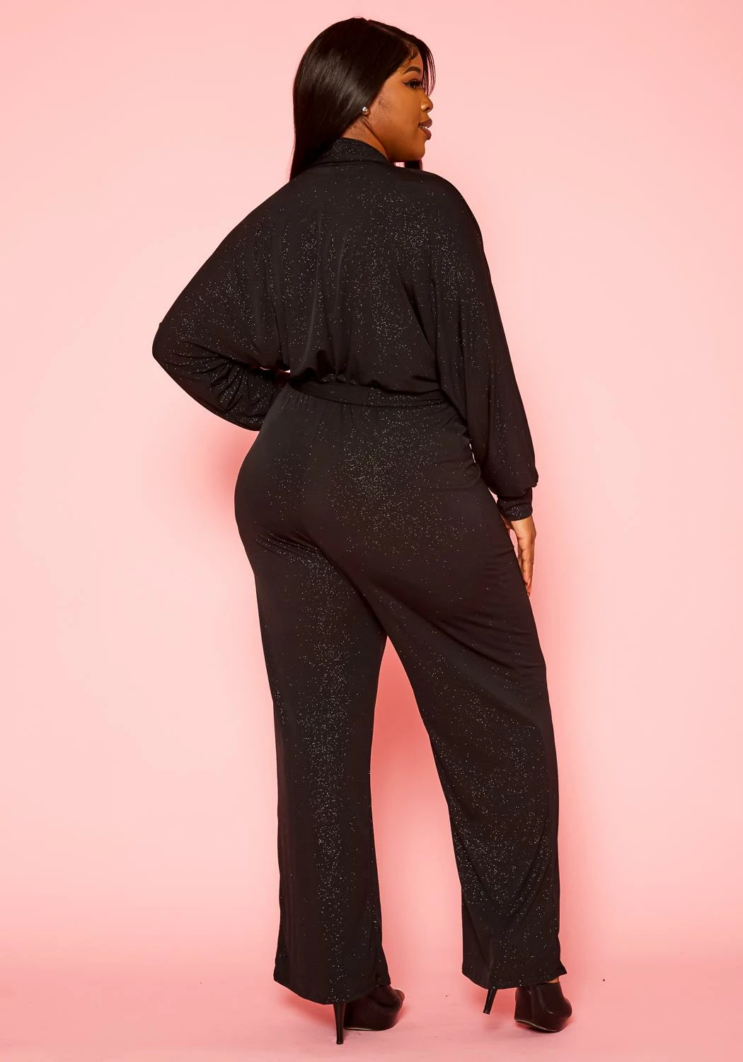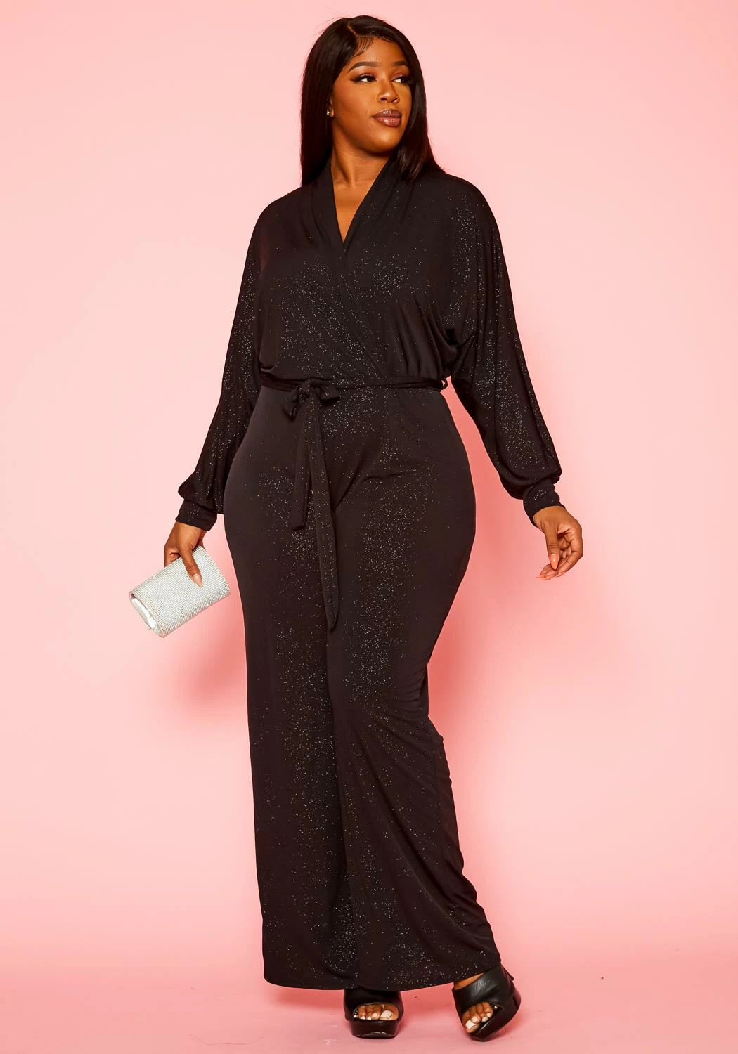 Timeless plus size women’s jumpsuit in lovely shimmer material, v-neck style, long sleeves, flare leg hem and waist tie ascent.