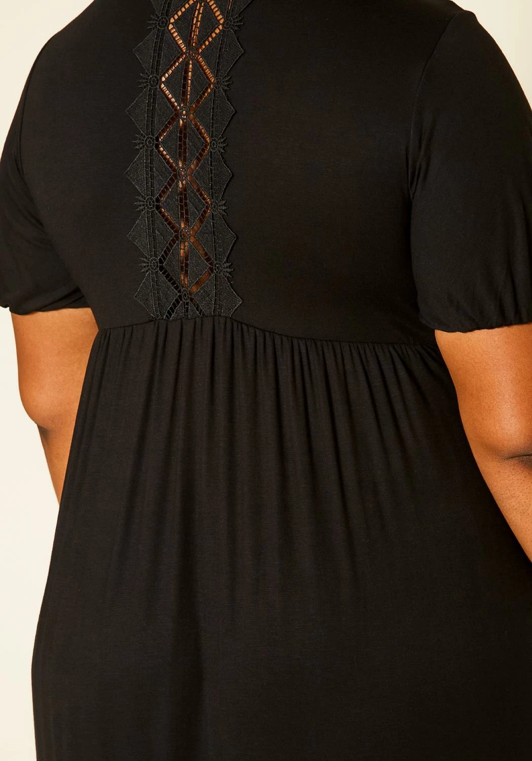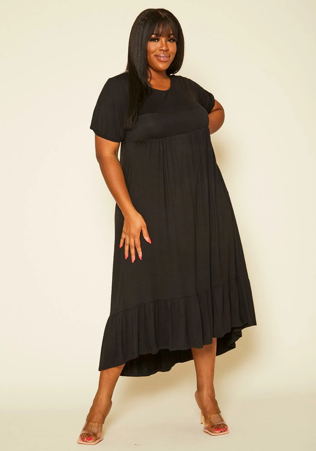 Effortless plus size women’s maxi dress in round neck style, short puff sleeves, ruffle flare hem and fit to flare design.