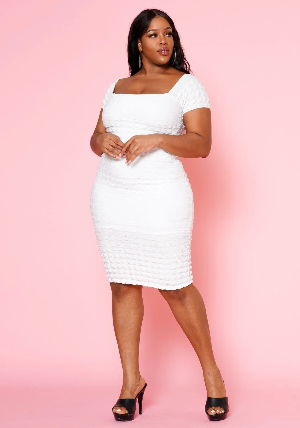 Favorite plus size women’s bodycon mini dress in smocked design, square neck style and short sleeves.