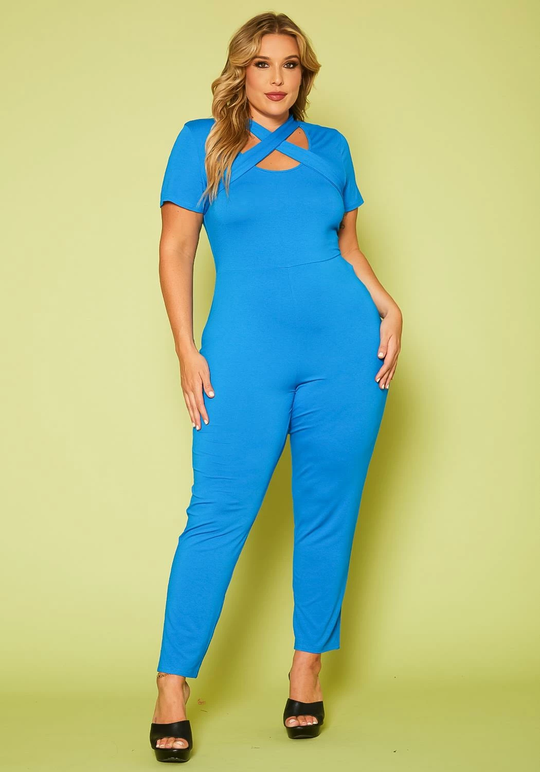 Plus size women’s jumpsuit featuring short sleeves, tube leg hem, cross front detail & back button closure with keyhole ascent.