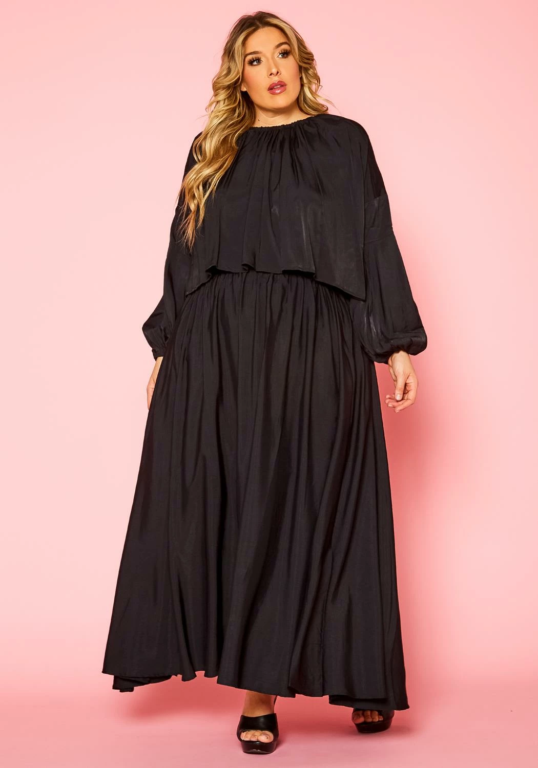 Plus size women’s maxi skirt in ruched design, puffy long sleeves and round neck style. Contains back tie closure.