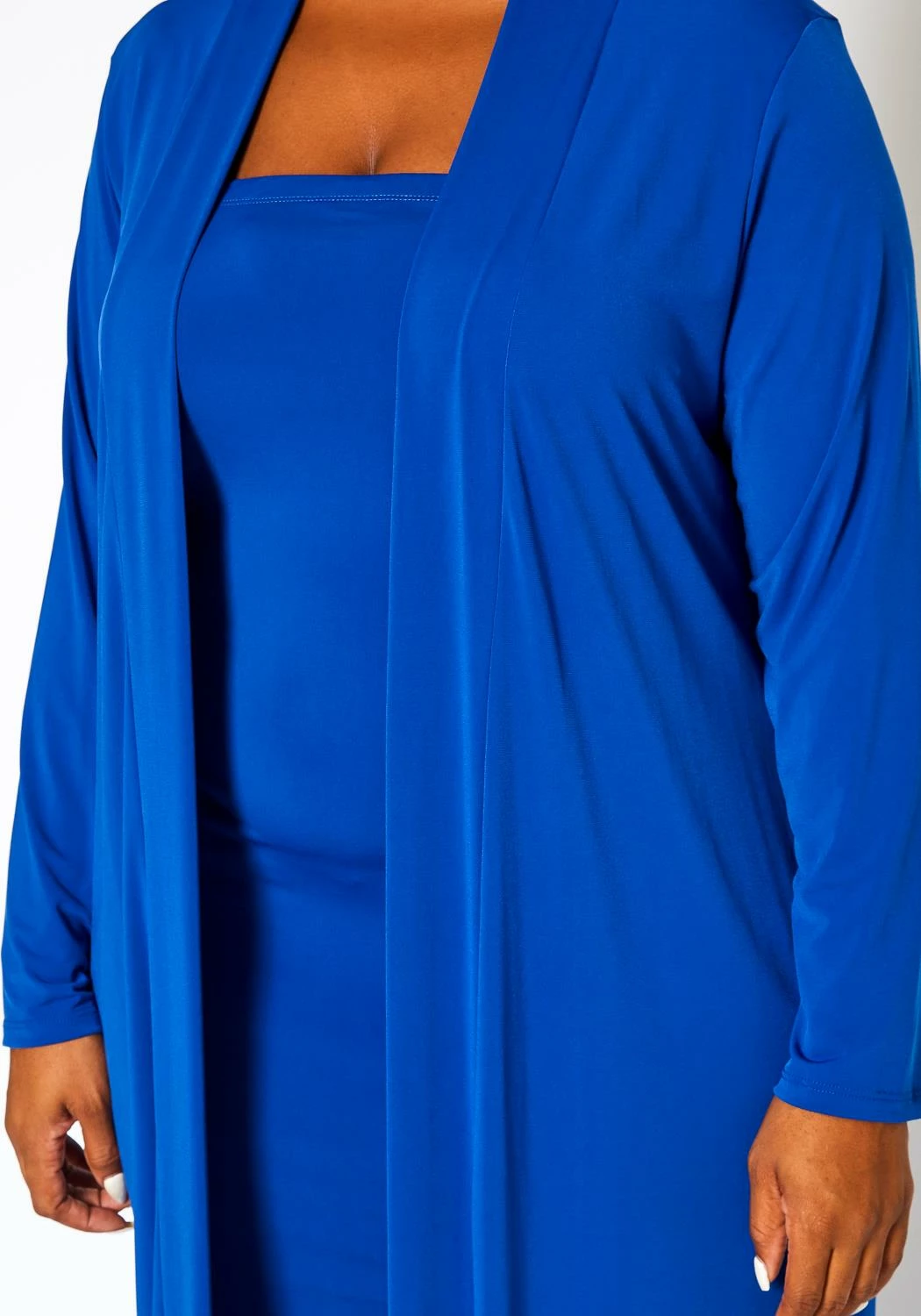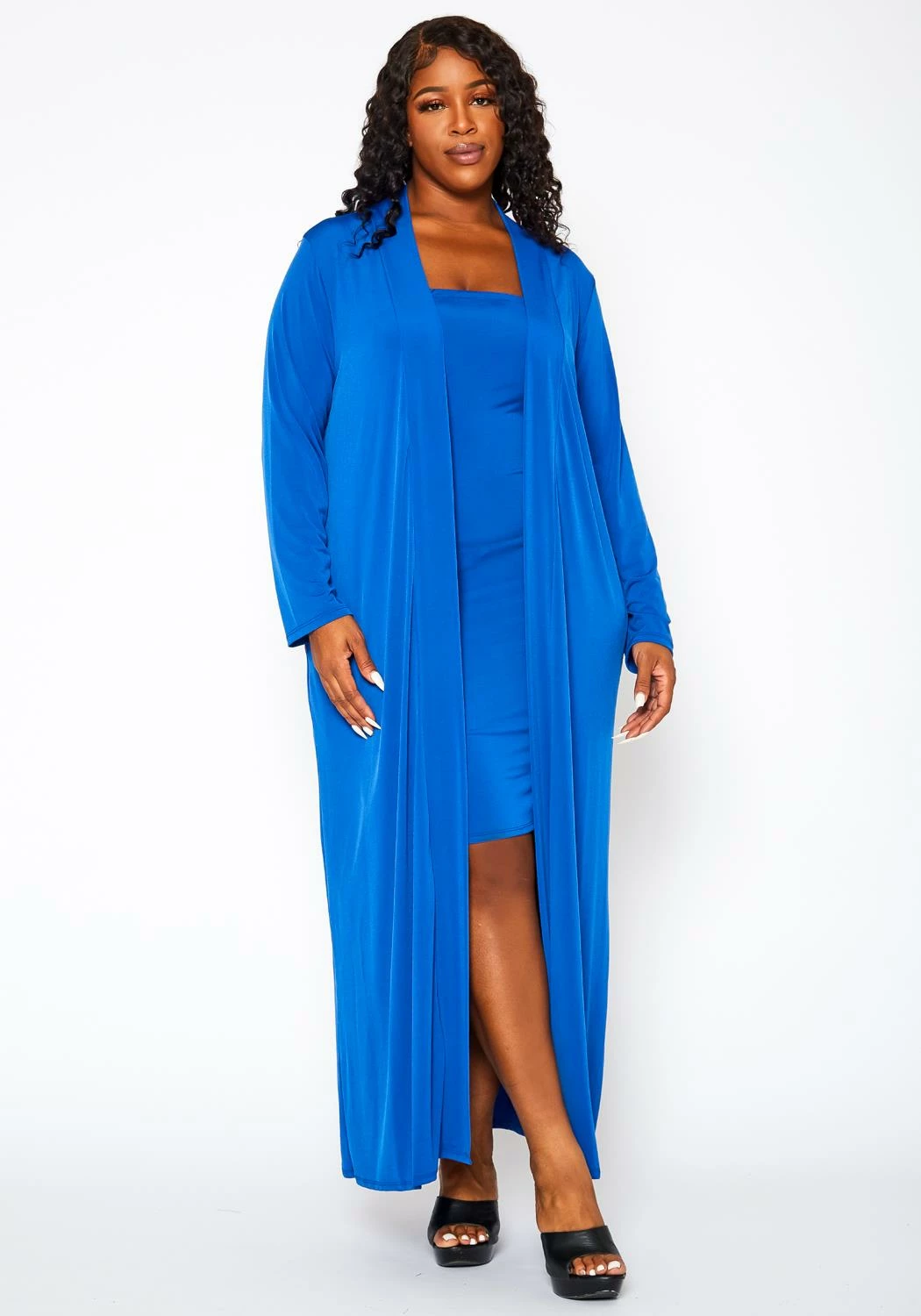 Lovely plus size women’s matching set which features a tube bodycon dress and duster cardigan.