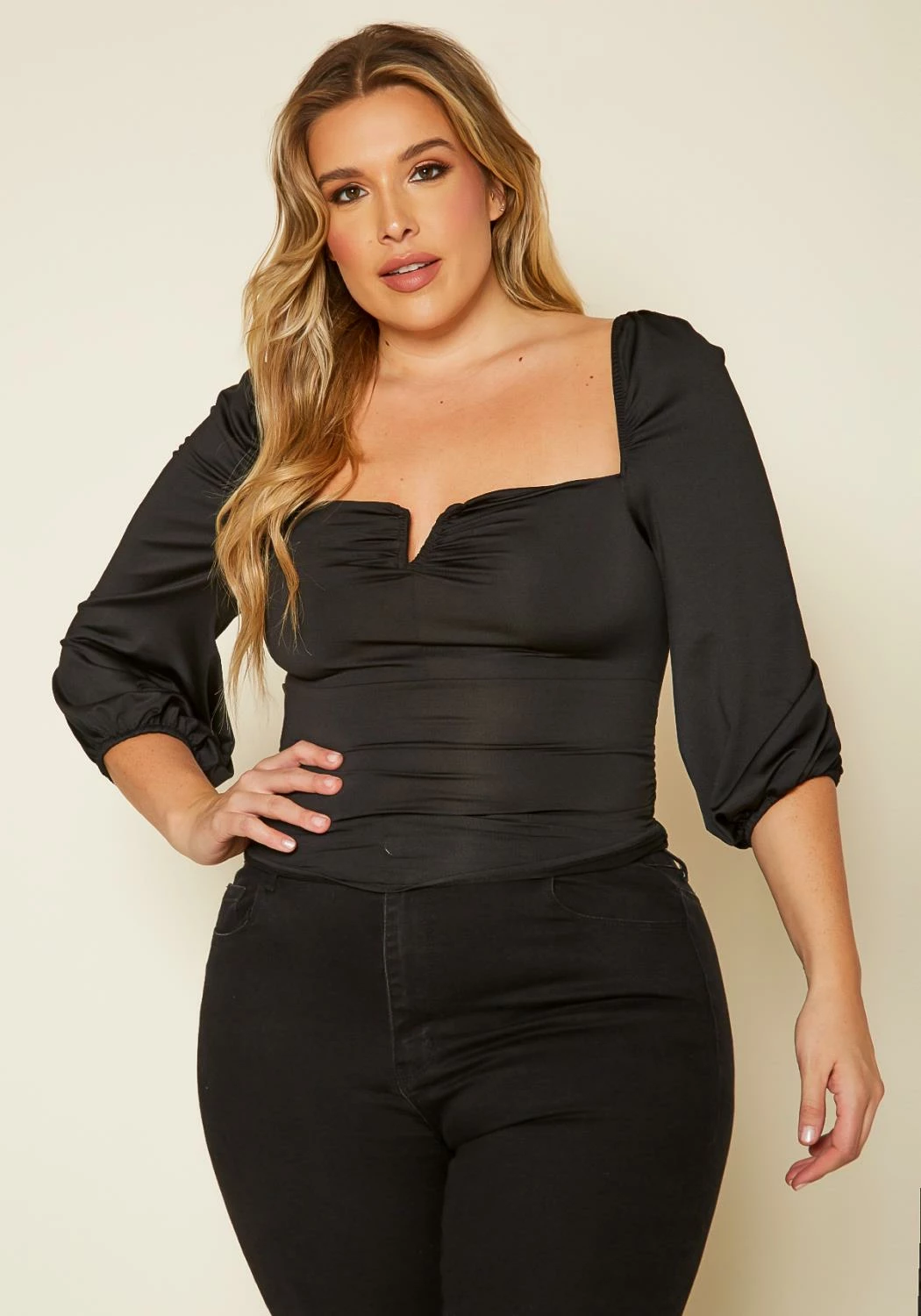 Plus size women’s top in square neck with V slit detail, 3/4 sleeves with elastic wrist cuffs and bodycon fit.