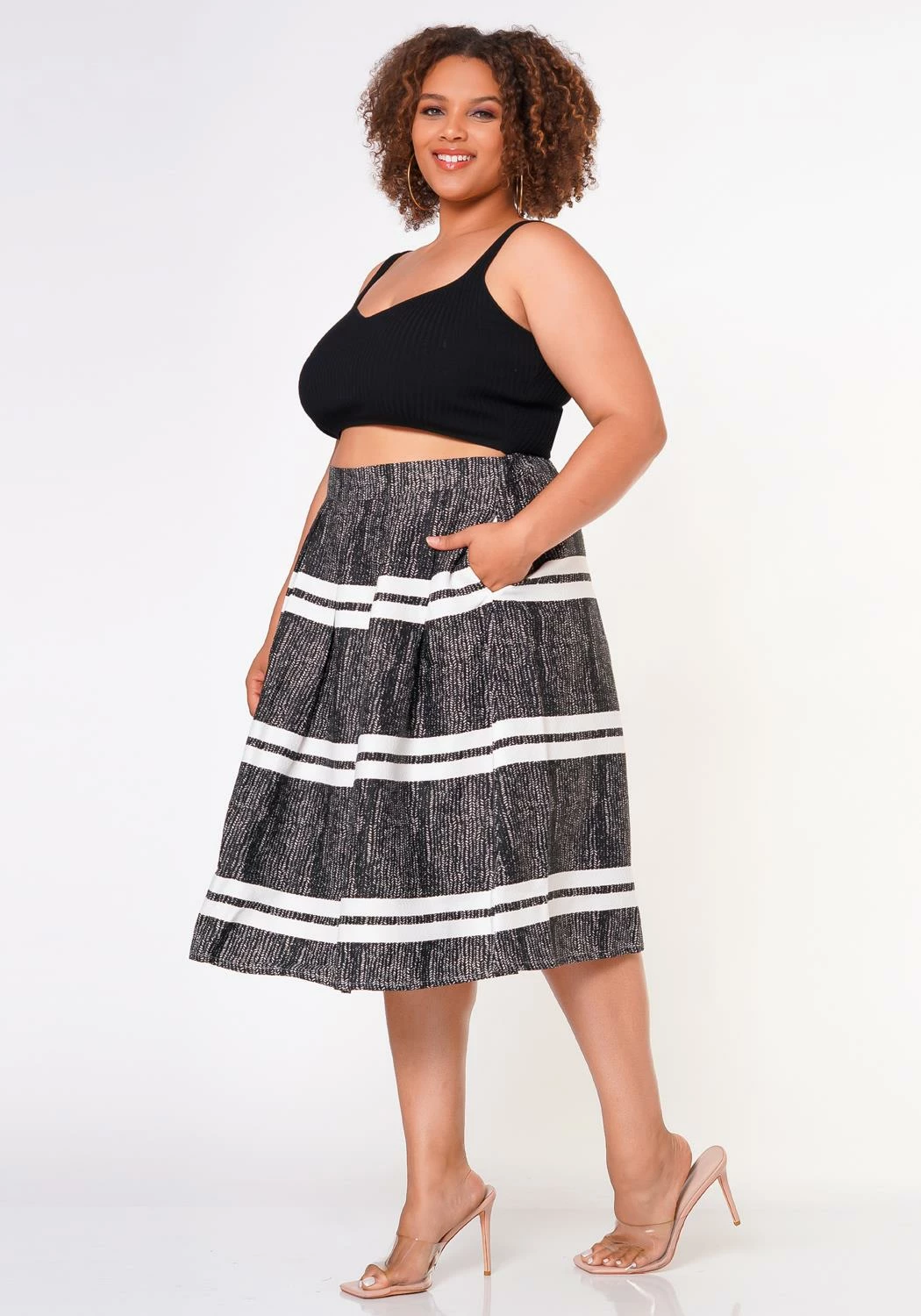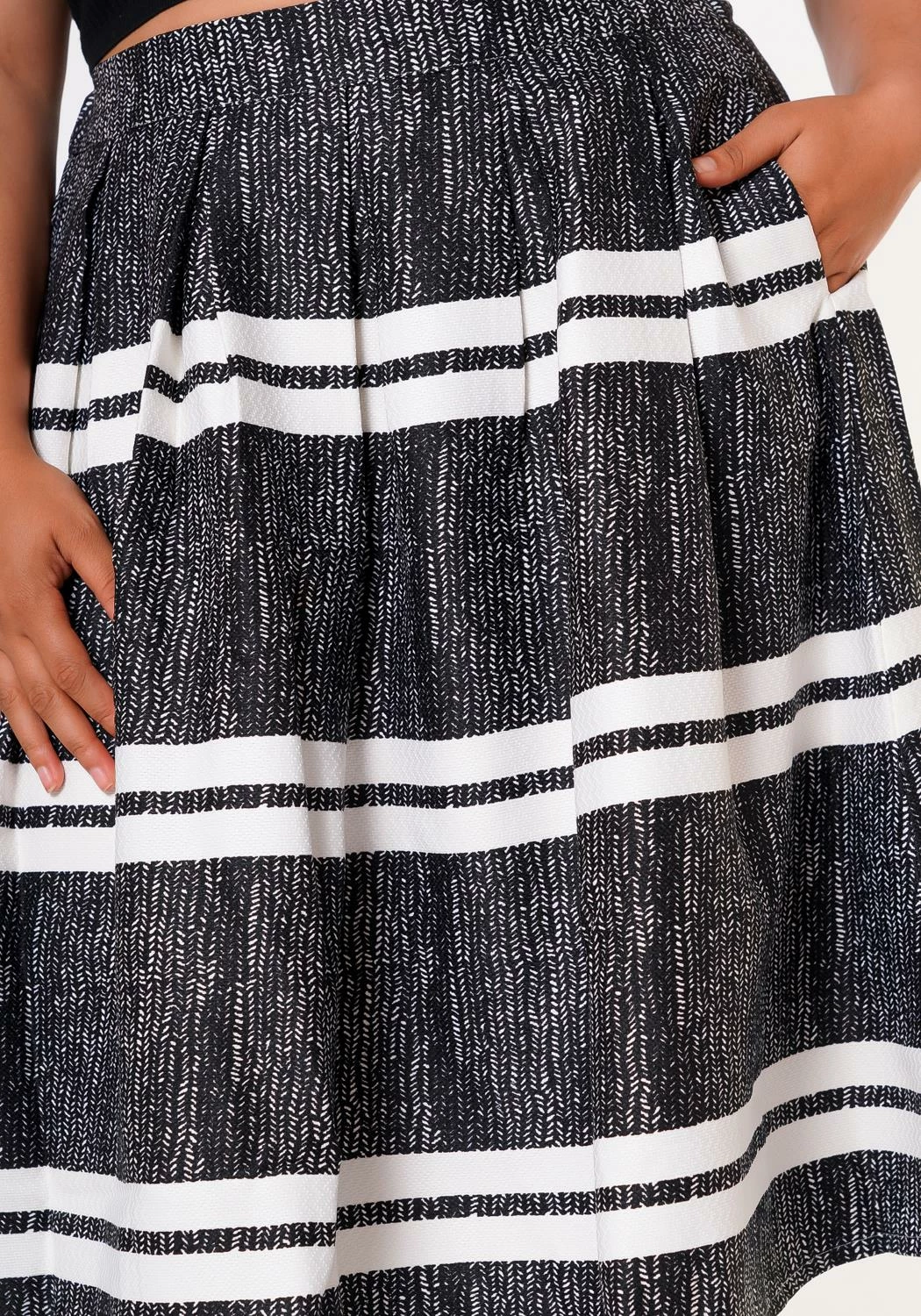 Casual midi skirt for plus size women which features a multi striped print, pocket hem and high waist style.