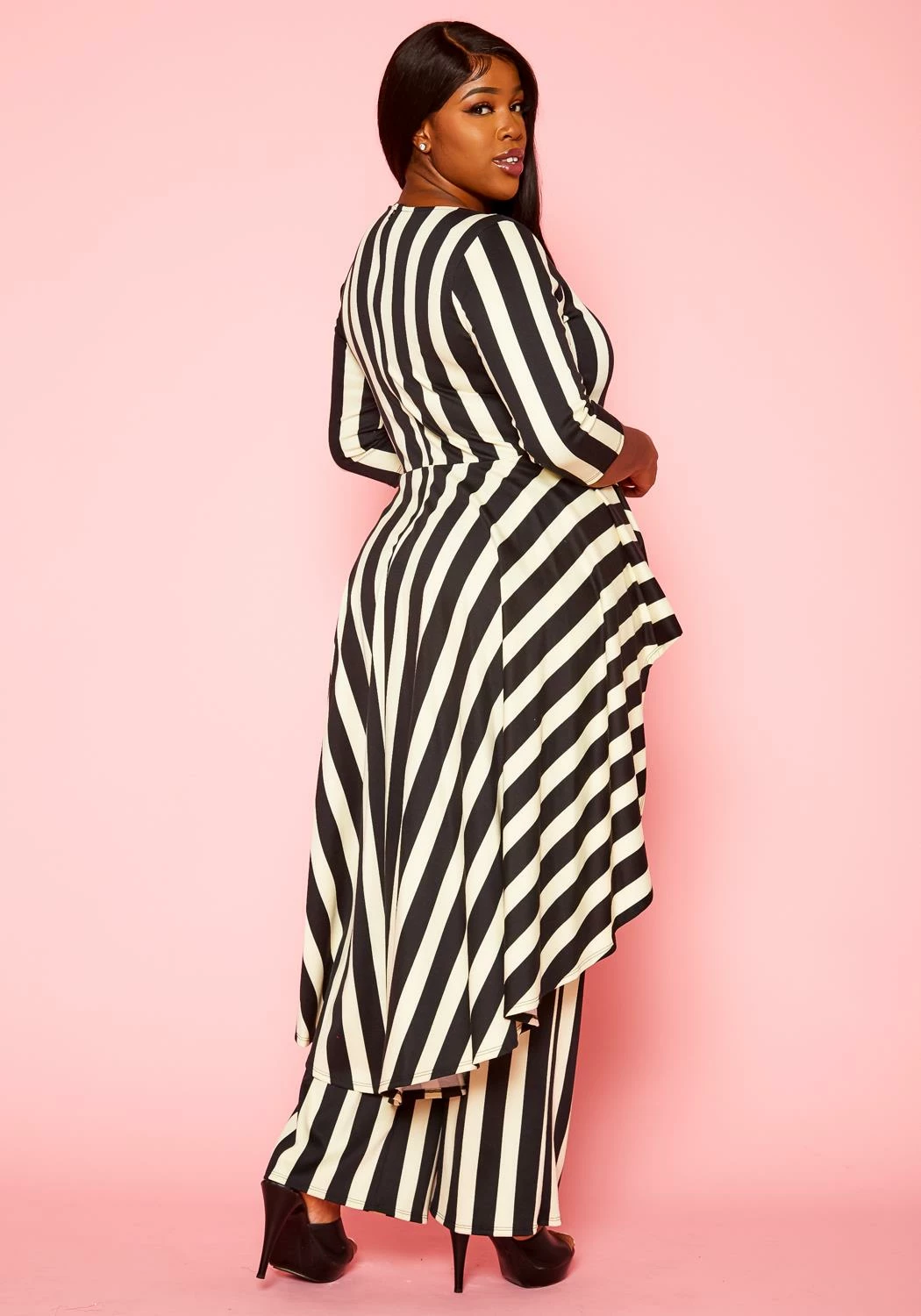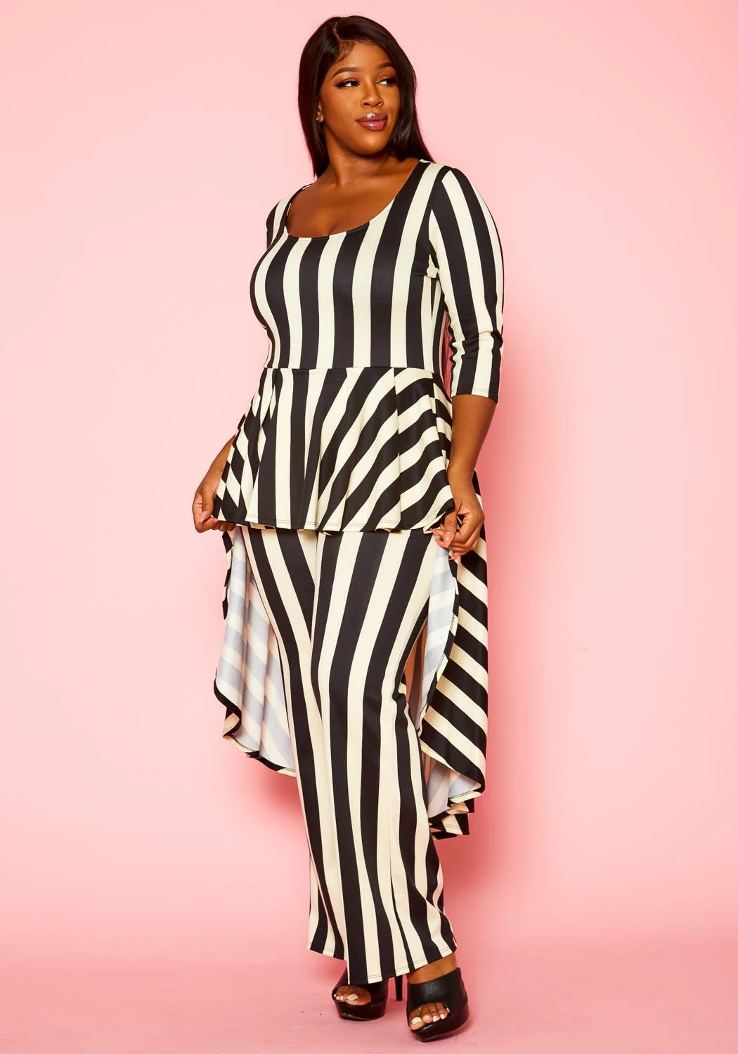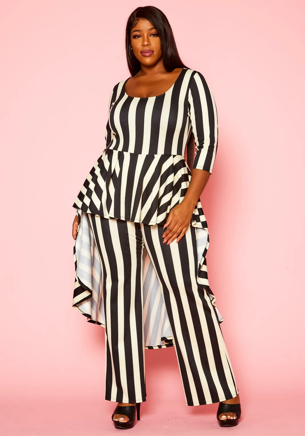 Classy plus size women’s matching set which features a high low peplum top, 3/4 long sleeves, square neck style and matching flare pants.