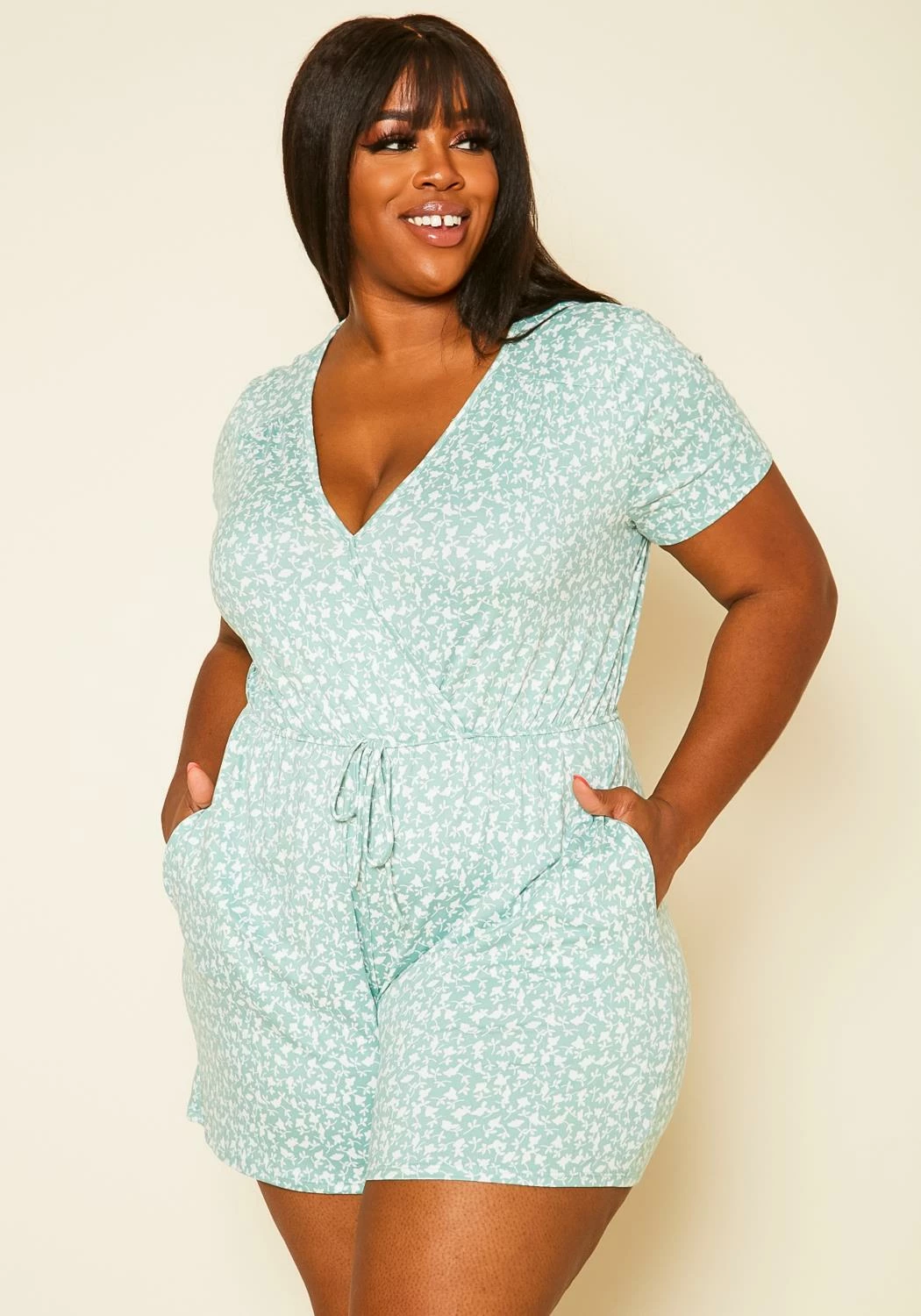 Plus size women’s romper featuring a surplice v-neck top, elastic waist hem with drawstring, short sleeves & back button closure.