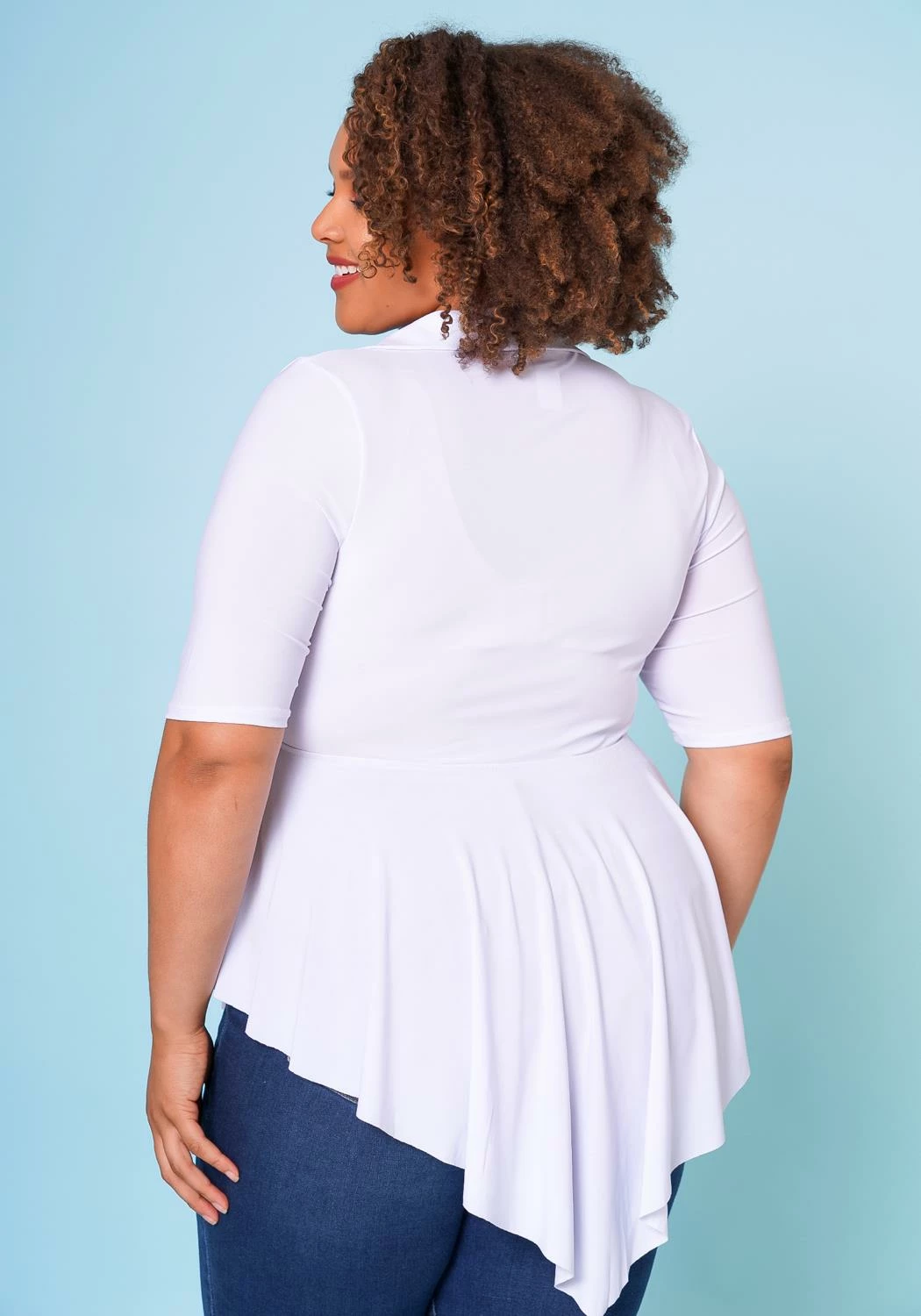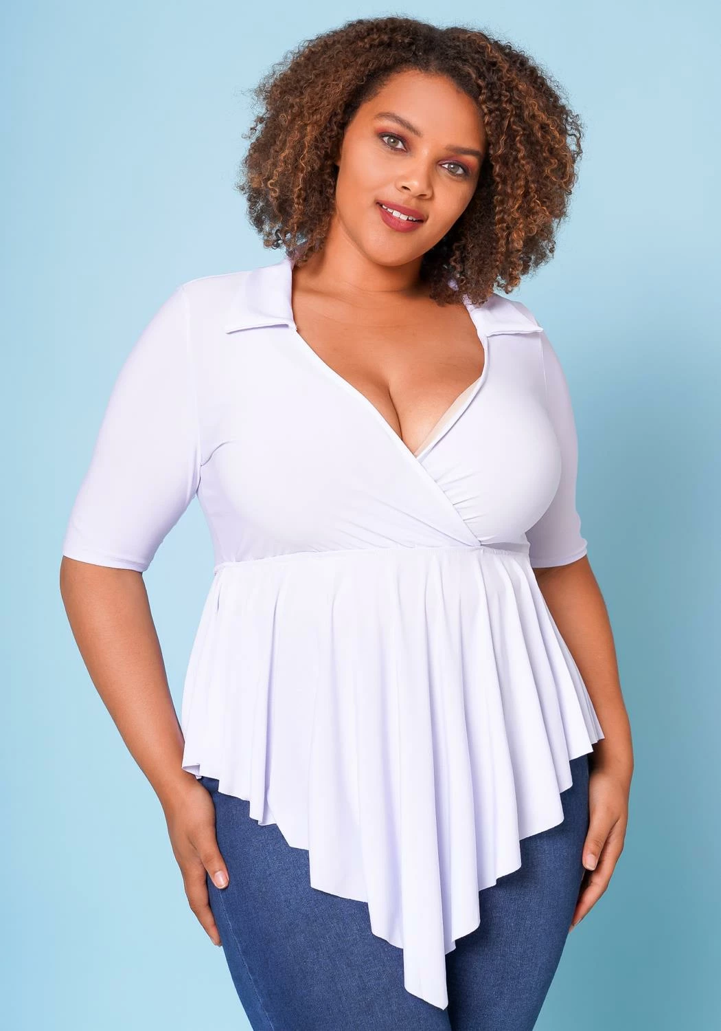 Plus size women’s top, featuring a surplice neck hem, collar style, short sleeves, peplum design with asymmetrical ascent.