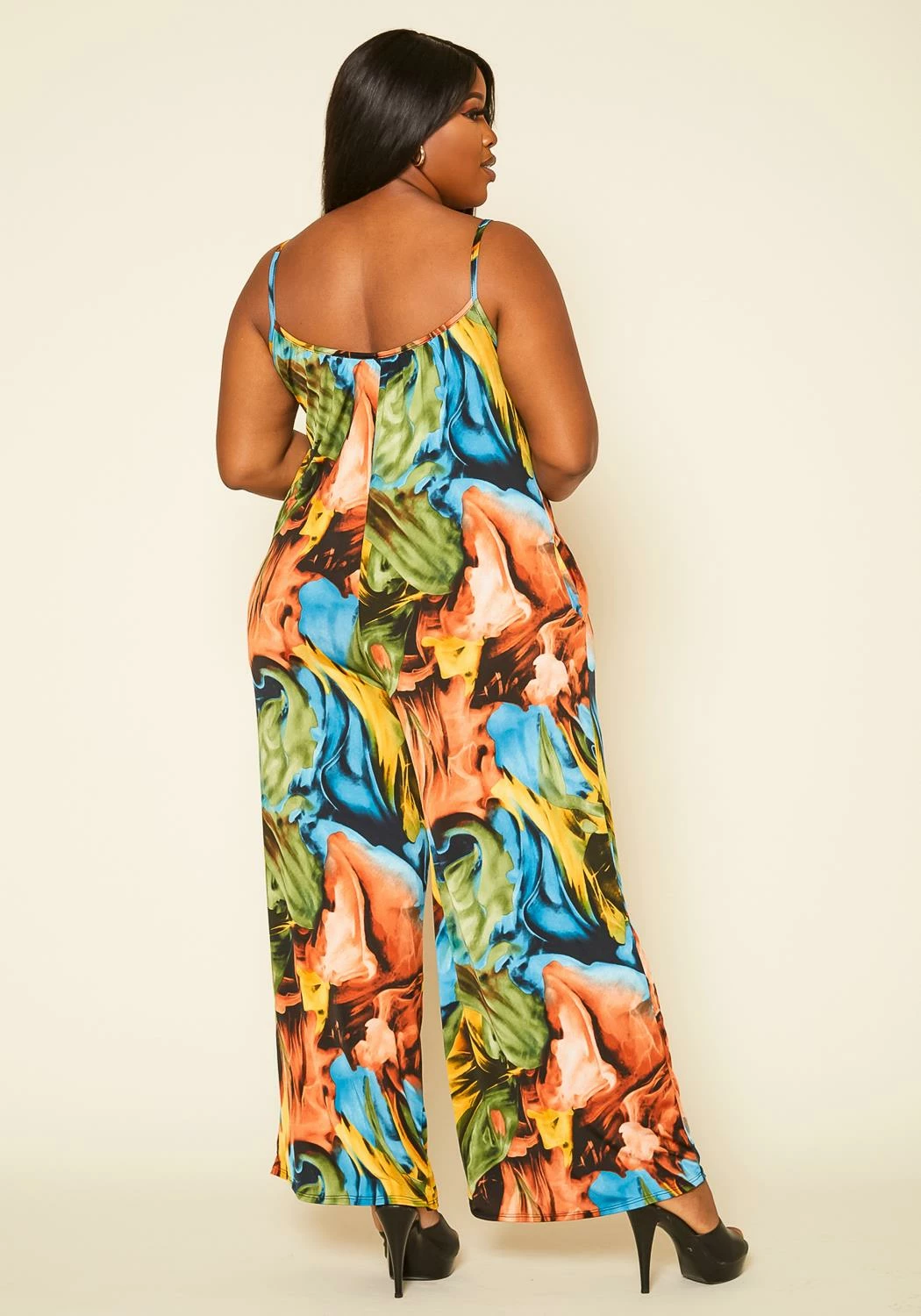 Plus size women’s jumpsuit in tank style featuring a swirl print, low scoop neck, tank sleeves and wide leg bottoms.