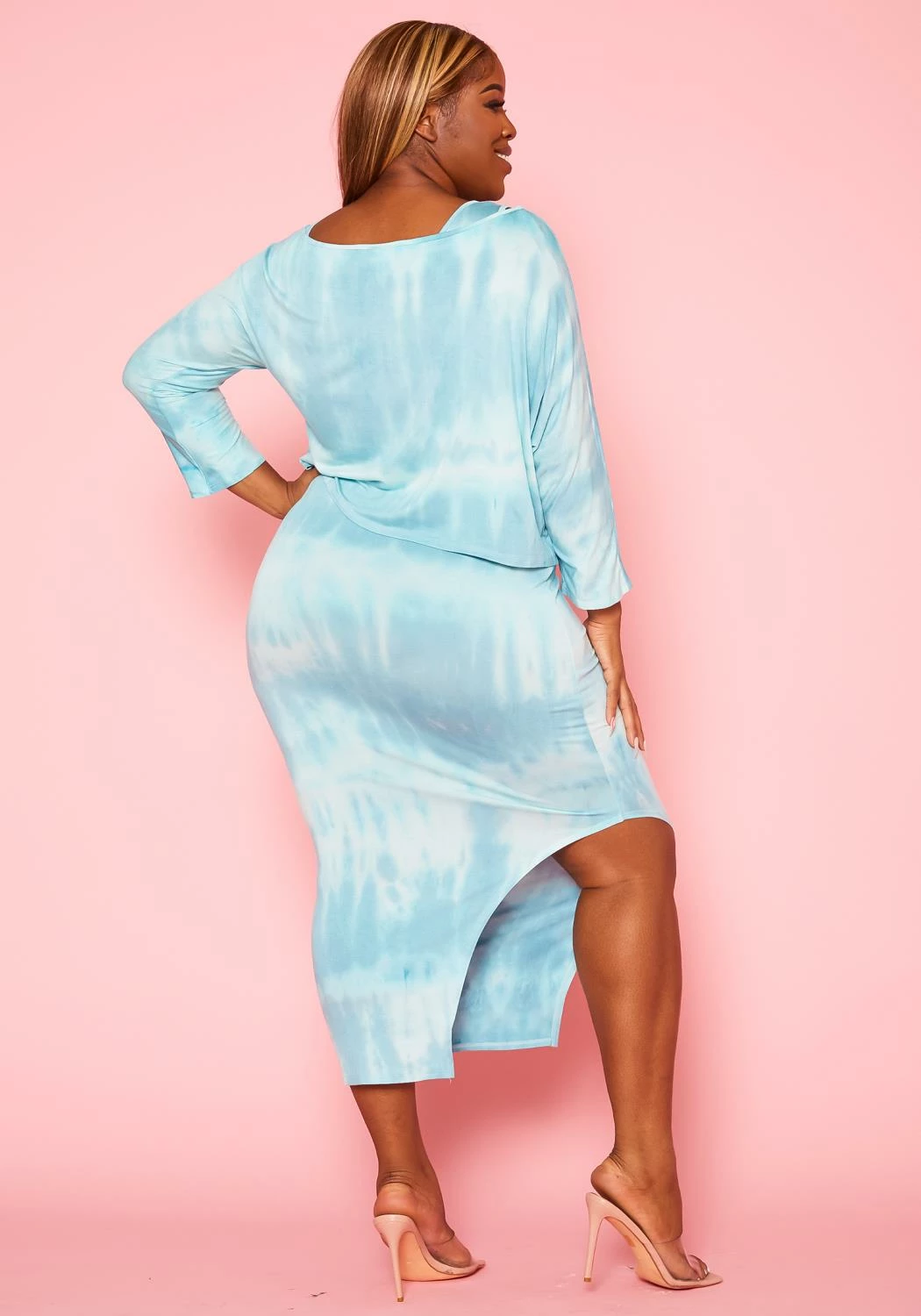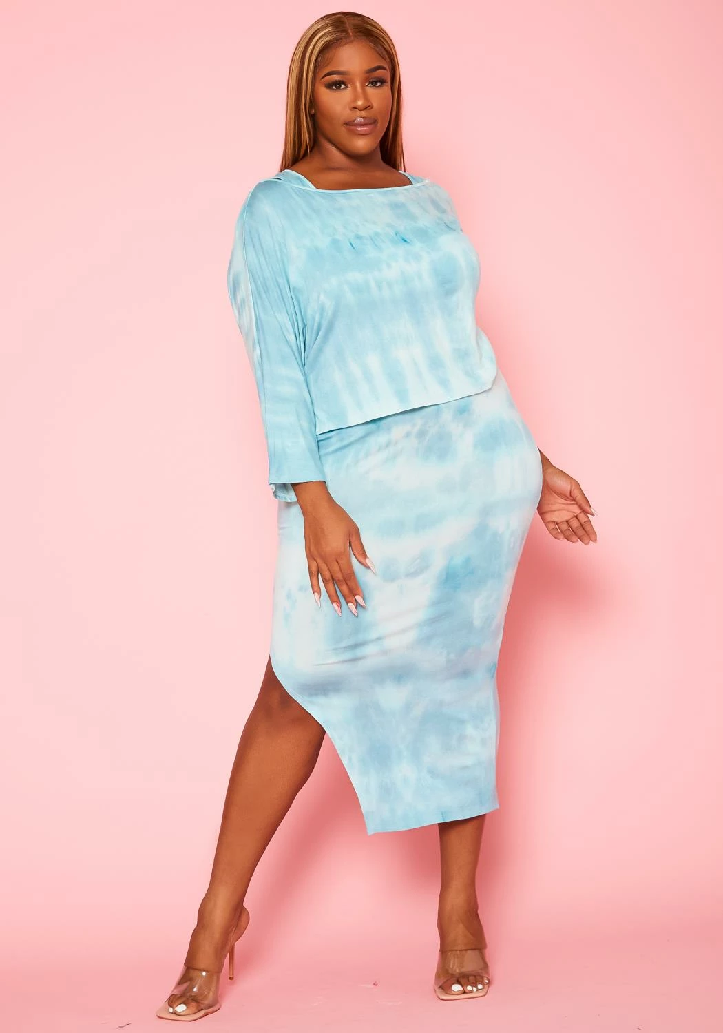 A comfortably stylish plus size women set which features an aqua tie dye sweatshirt that can be worn over a tank midi dress for a more casual vibe.