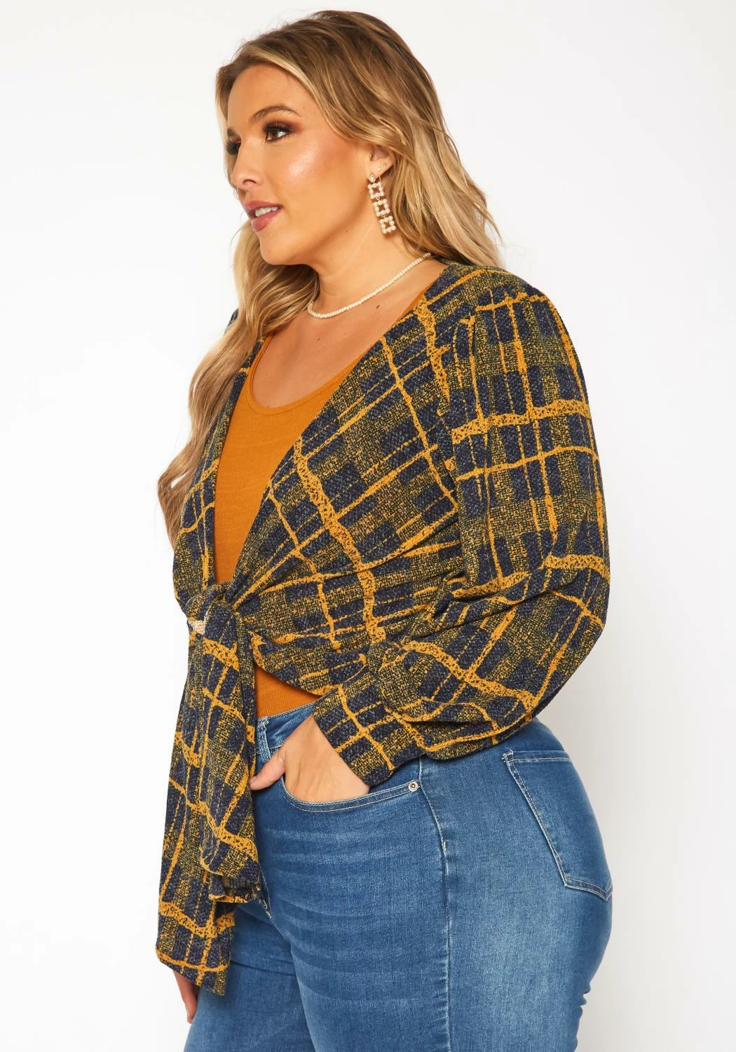 Plus size women’s stylish tassel knot cardigan with puffy long sleeves, fitted wrist cuffs and deep v-neck front.