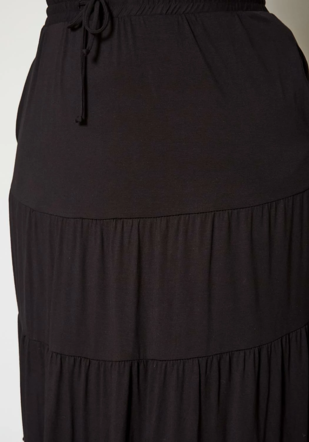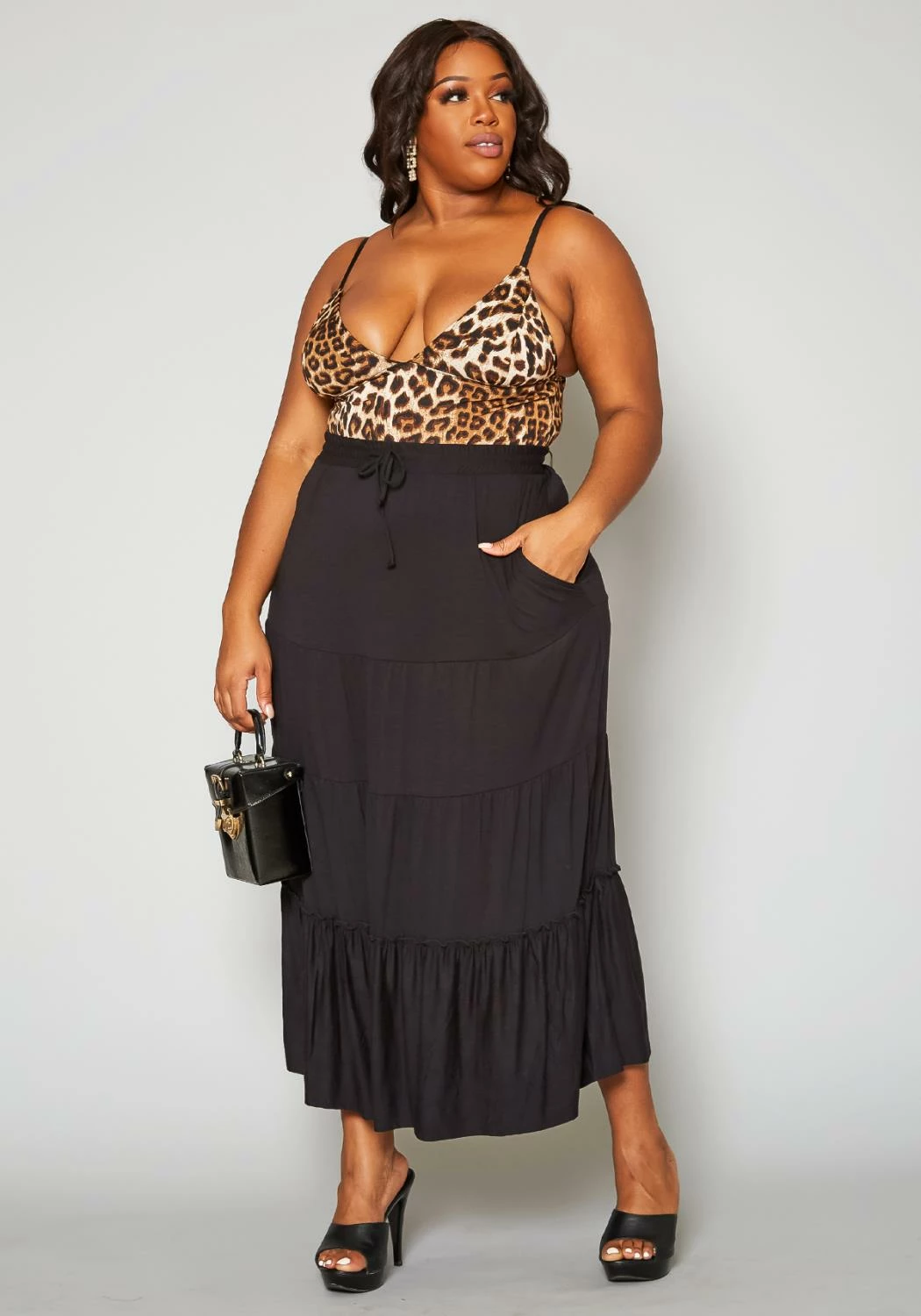 Lovely plus size women’s maxi skirt in tiered design, high waist style, bow ascent and pocket hem.