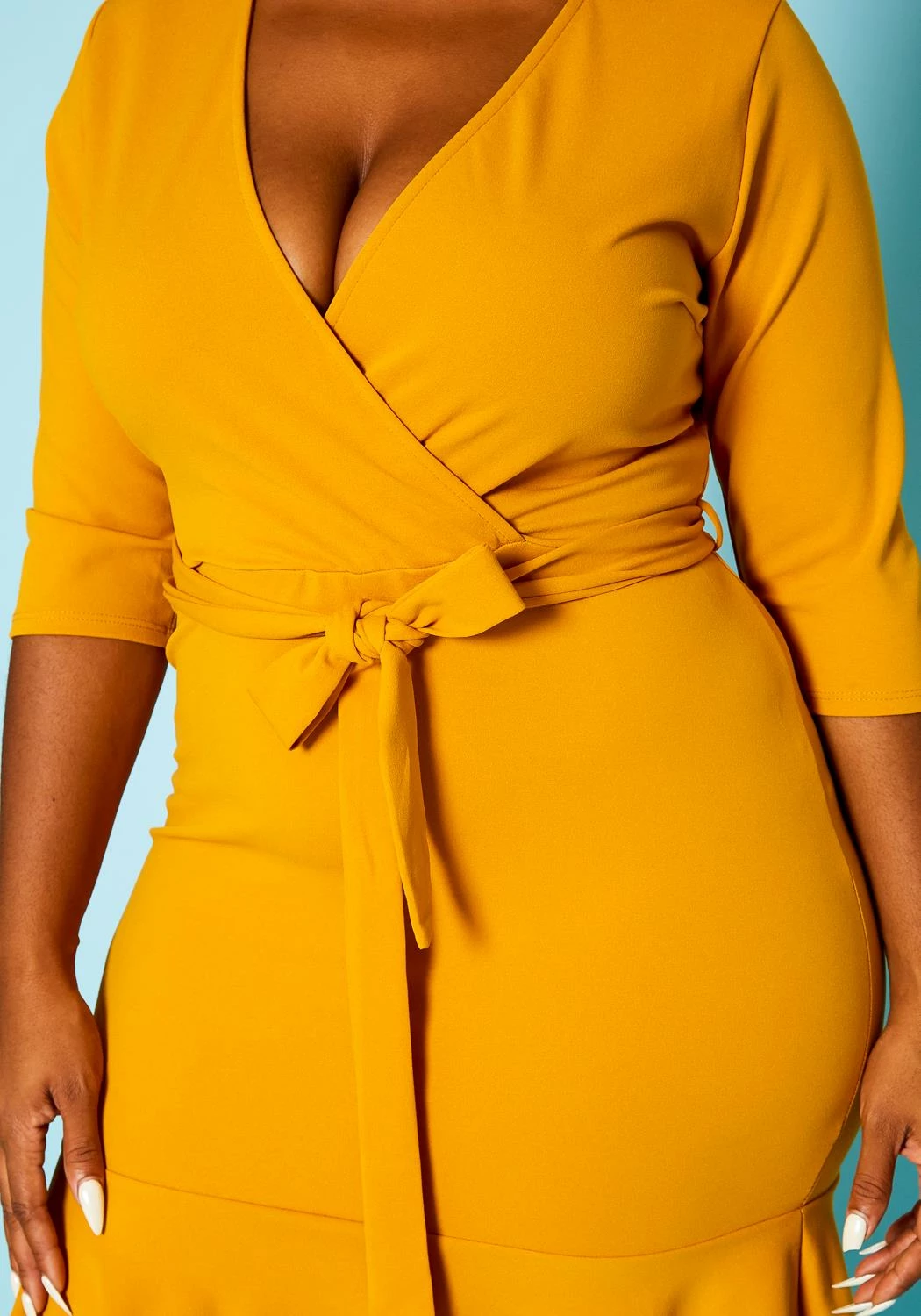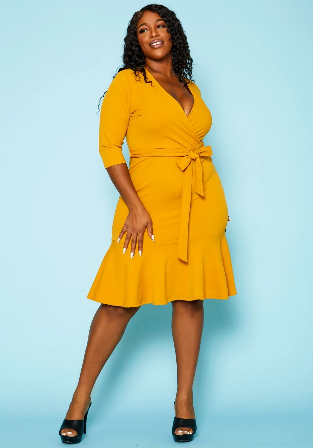Lovely plus size women’s mini dress in v-neck style, short sleeves, waist tie ascent and flare hem.