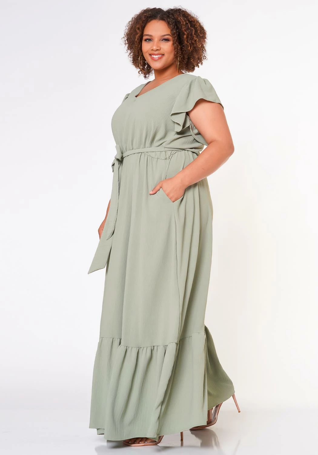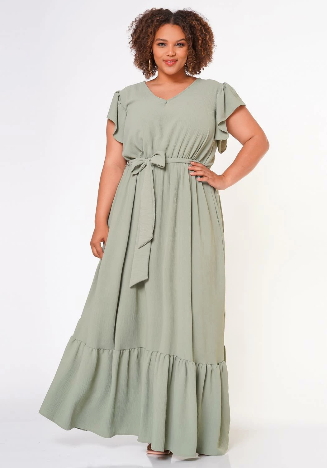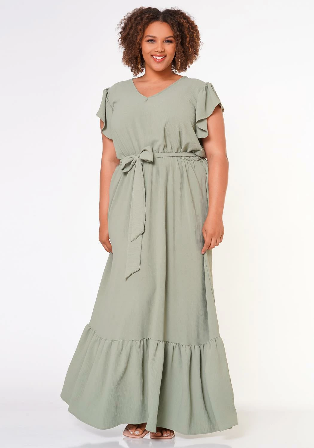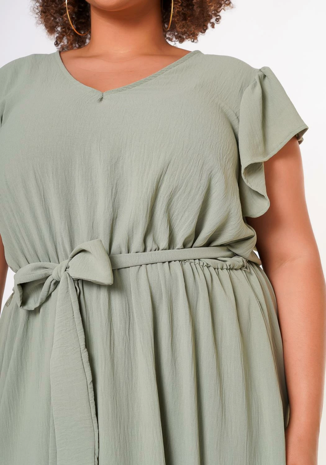 A perfect comfortable short sleeve spring dress with ruffled detailing and waist tied bow.