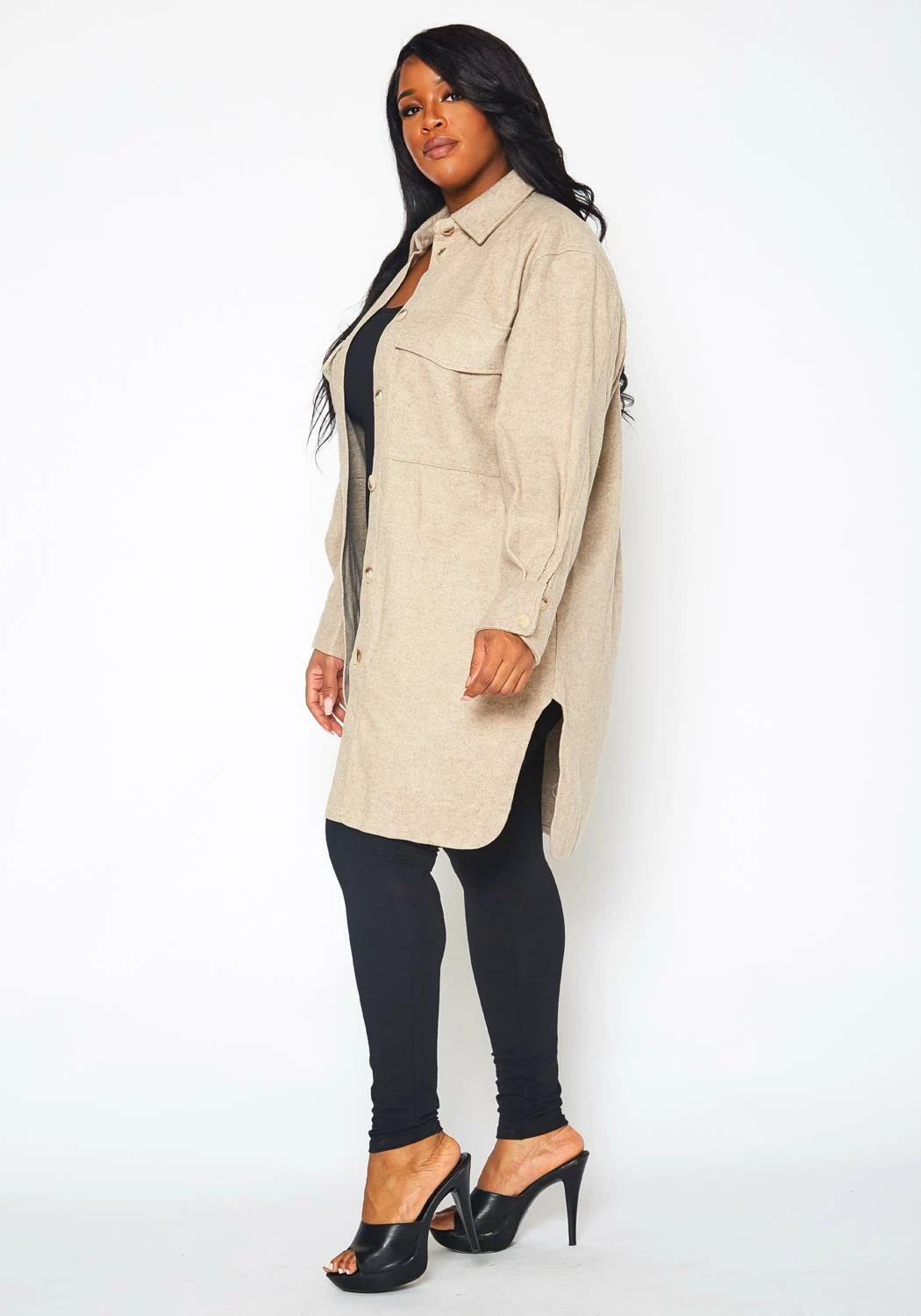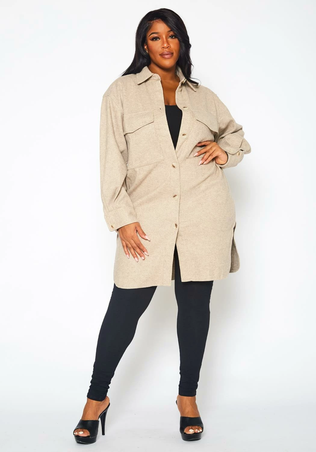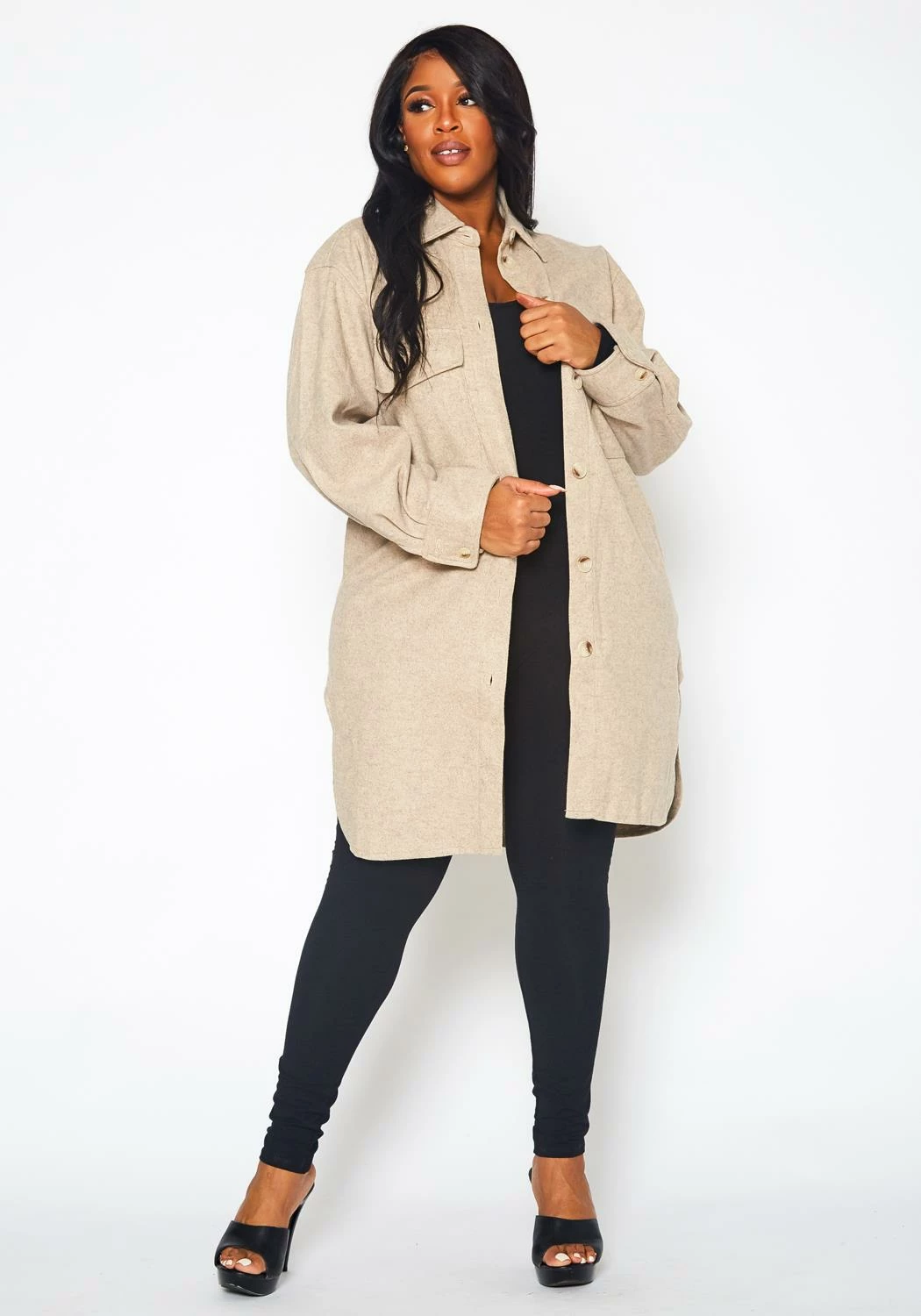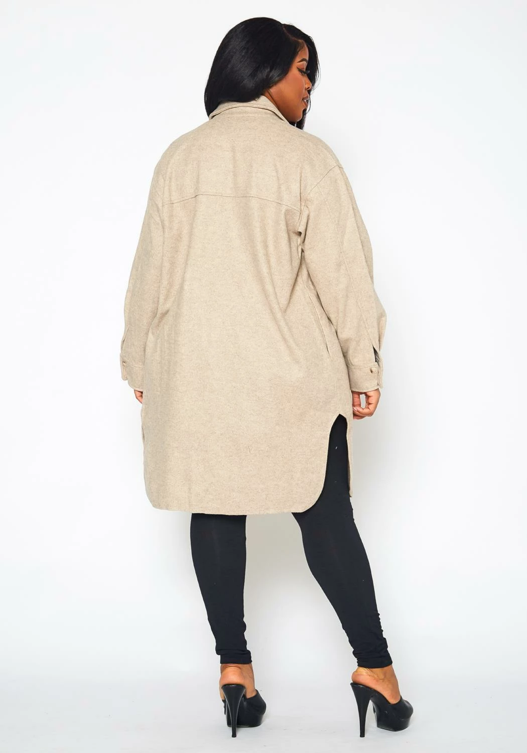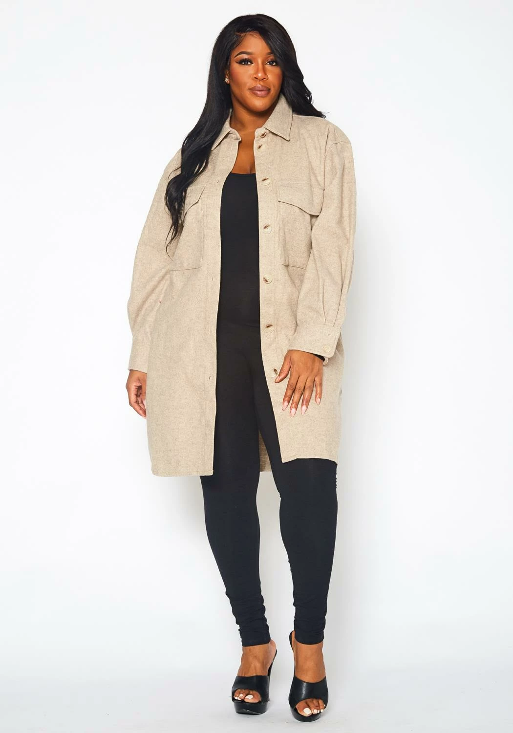 Chill-blocking wool knit coat for plus size women in collar neck style, button front closure, pocket hem and longline fitting.