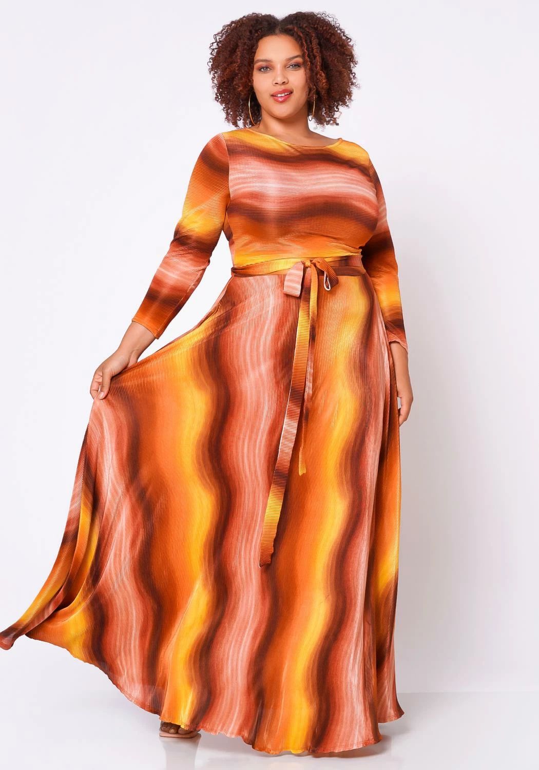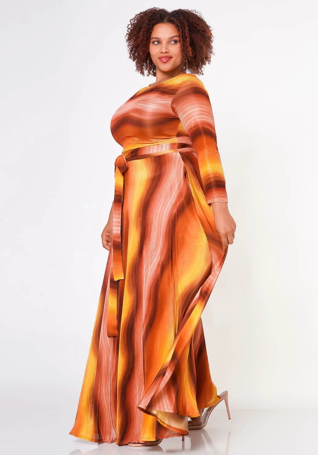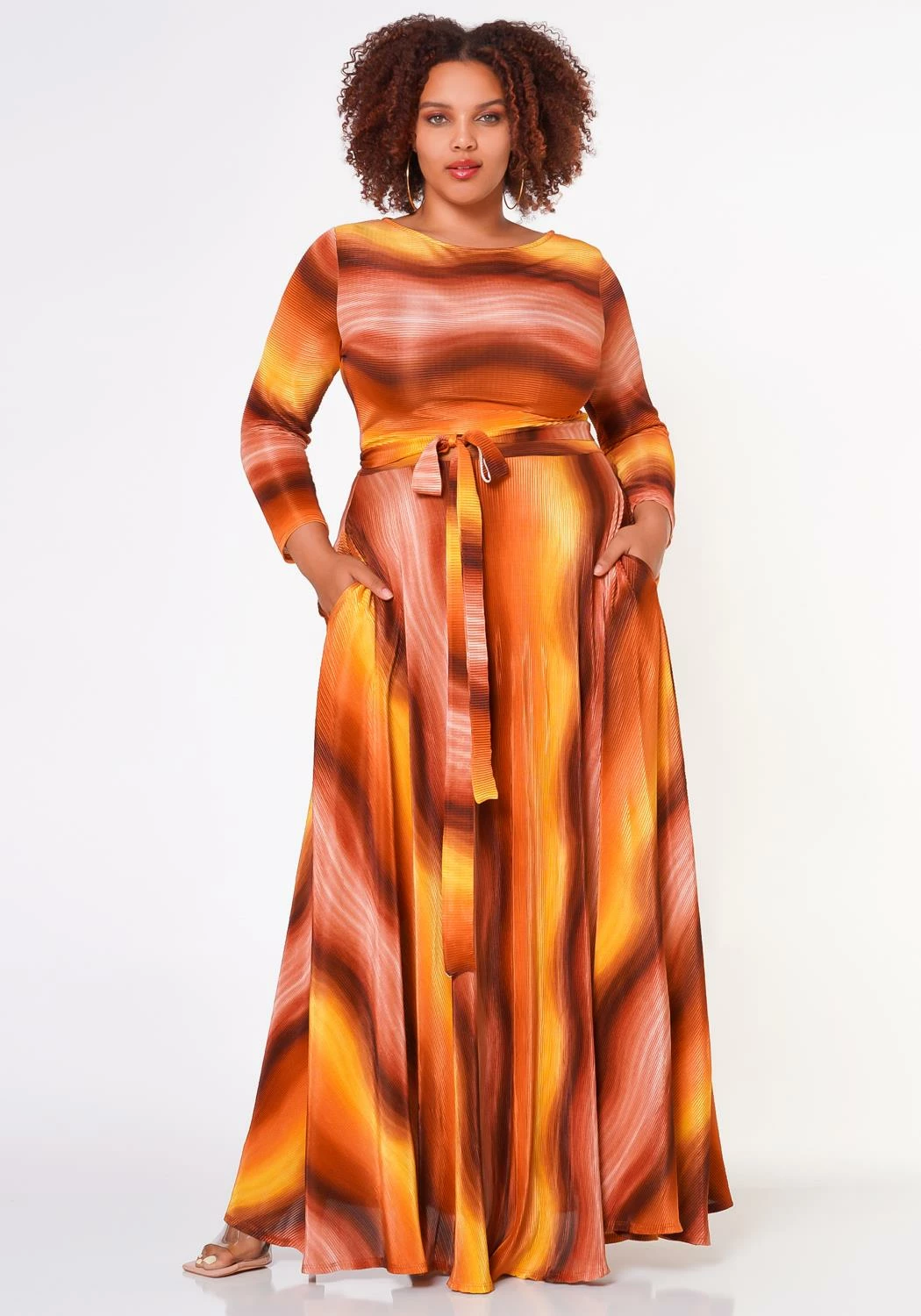 Lovely plus size women’s fit to flare maxi dress with wave pattern, 3/4 fitted long sleeves, pocket hem and waist tie ascent.
