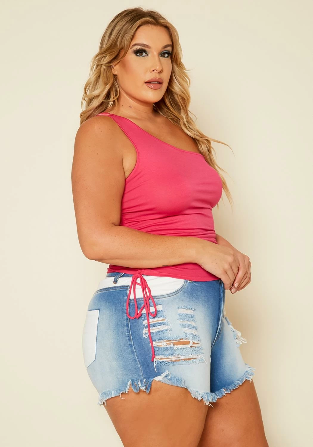 Plus size women’s shorts in denim style featuring a distressed detail with front white faux pockets and back white pockets.