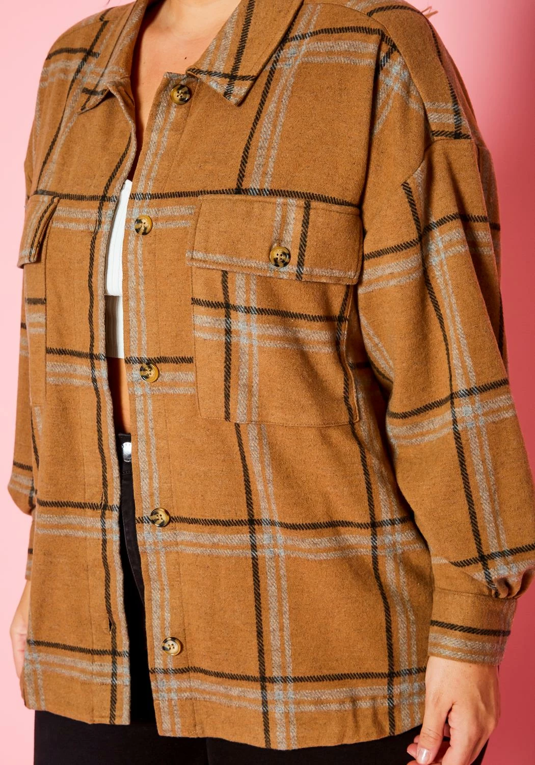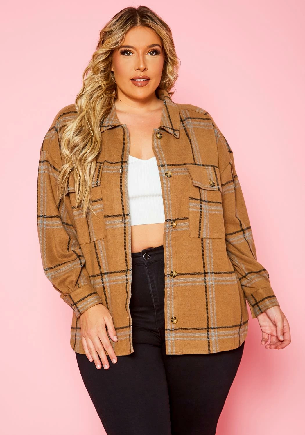 Casual plus size women’s flannel jacket in wool material, plaid pattern, collar neck style and button front closure.