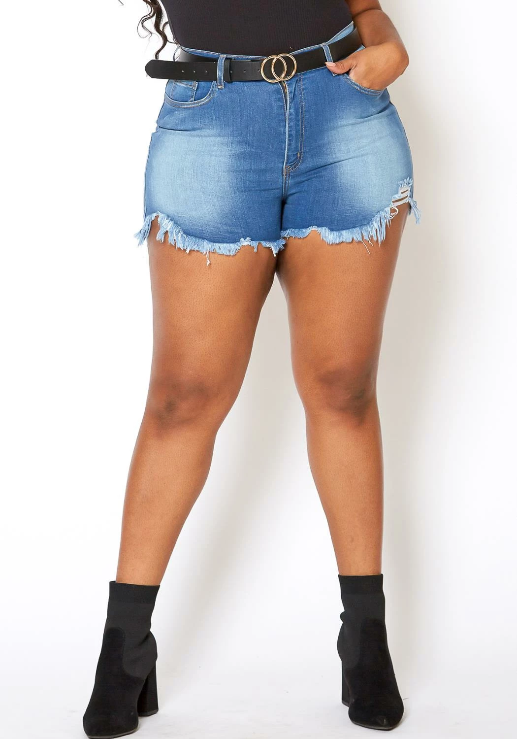 Asoph x Vibrant plus size women’s light center washed out denim mini shorts with comfy high waist fit and frayed raw hem detail.