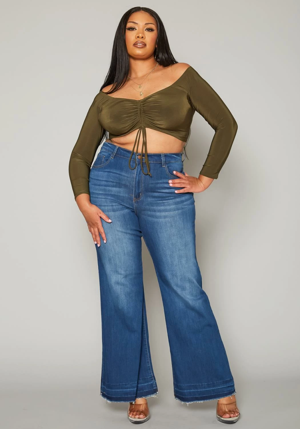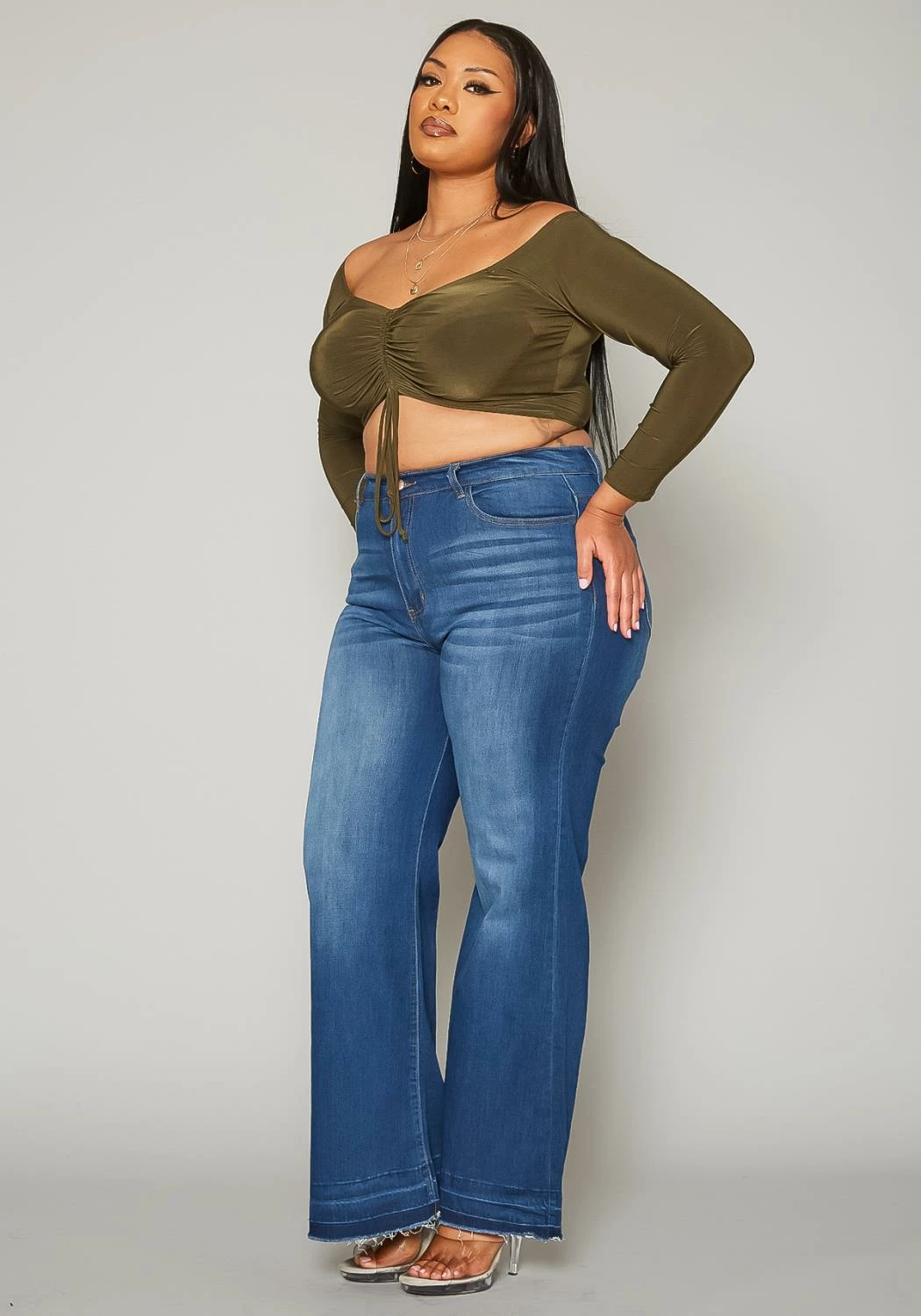 Asoph x Vibrant plus size women’s mom jeans in deep blue denim color, high waist style, belt loop holes, pocket hem and fray hem detail.