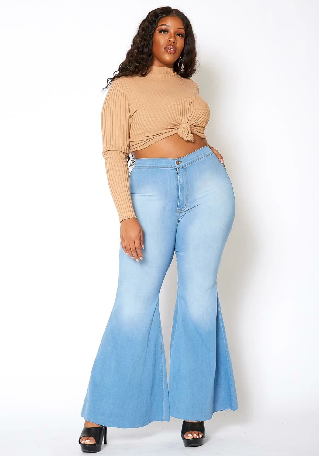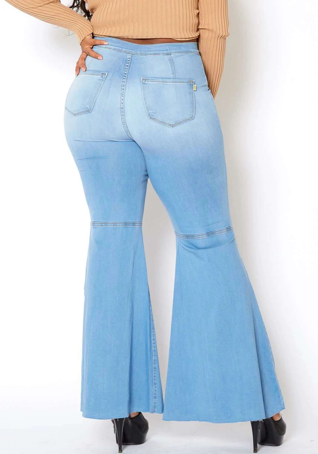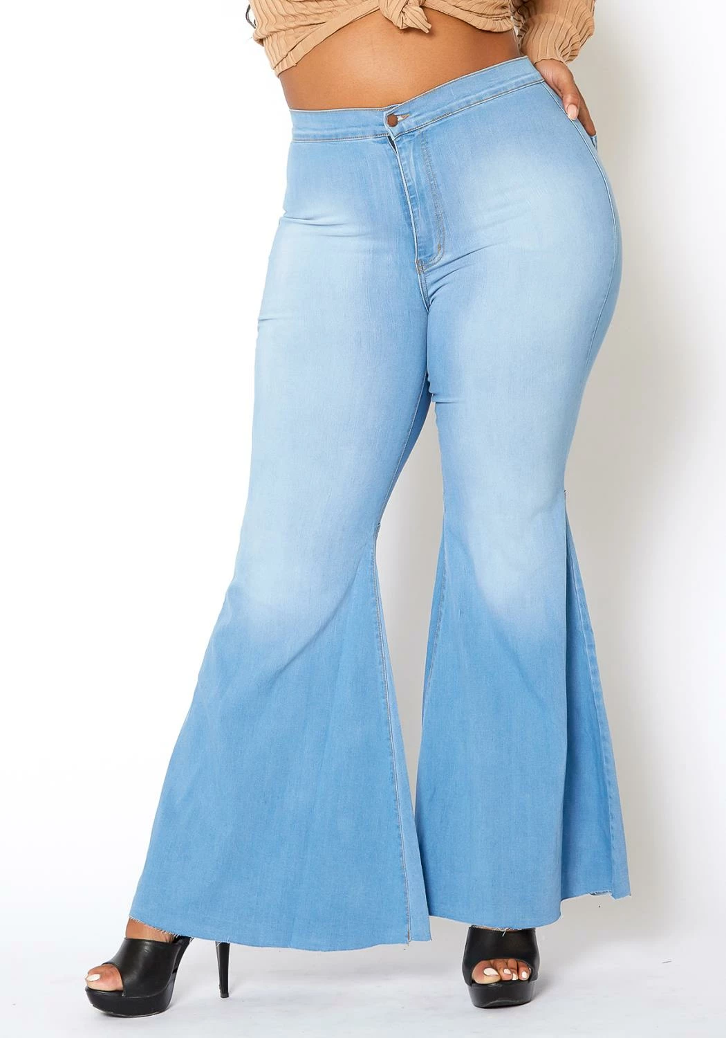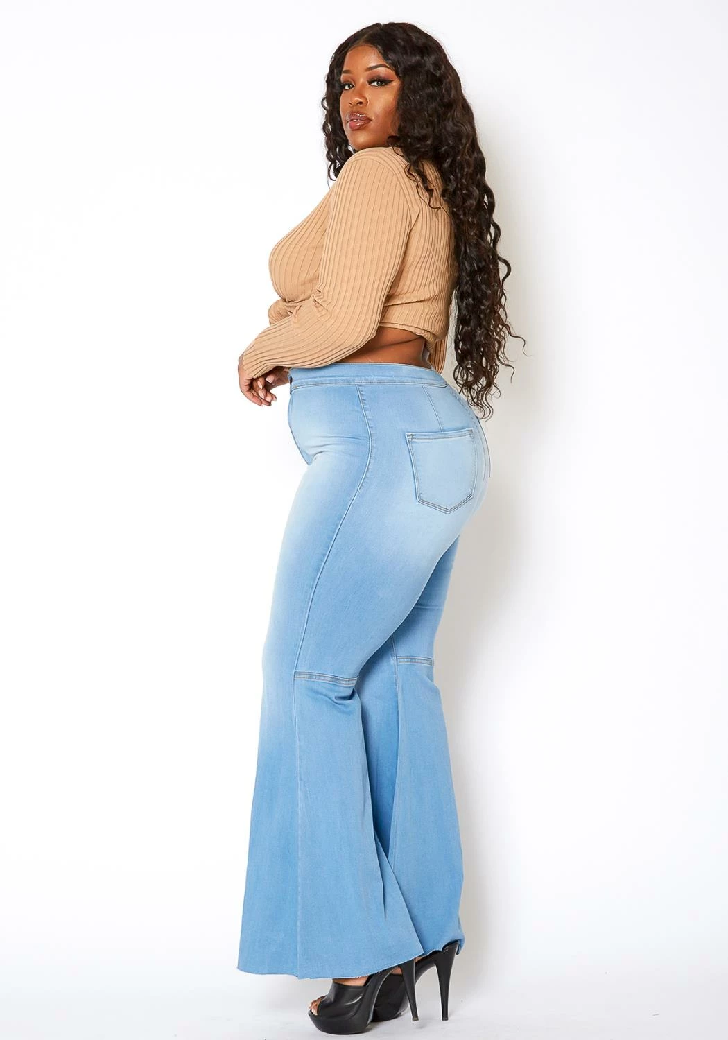 Asoph x Vibrant plus size women’s bold flared bell bottom high waist jean which features a raw cut end hem, back binding detail and pockets.
